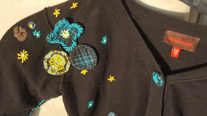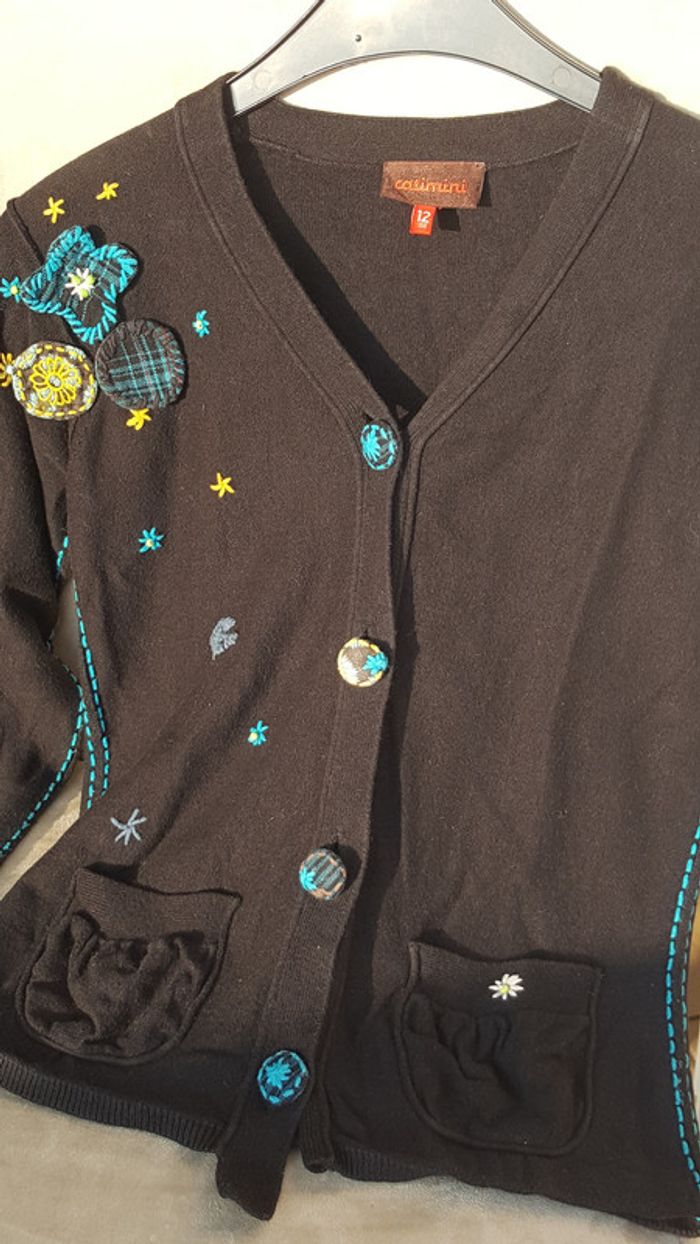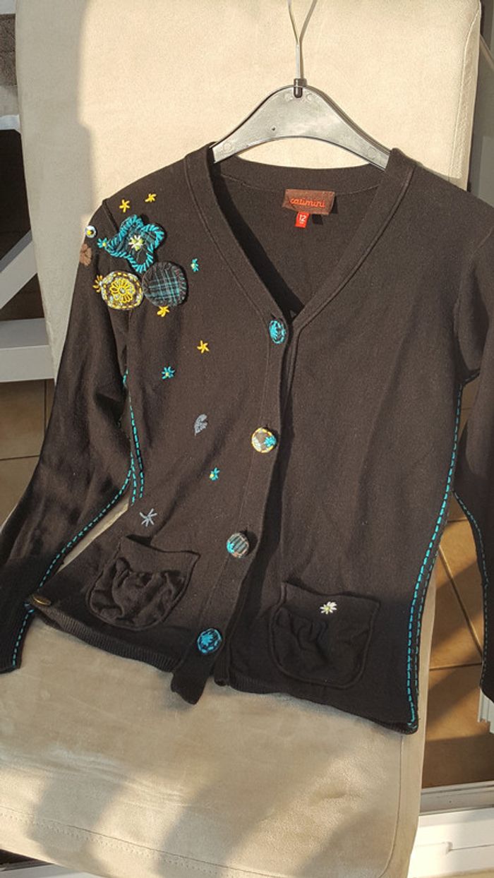 superbe gilet Catimini noir assorti à des hauts que je vends également. boutons recouverts de tissus contrastés. Broderies et ajouts. surpiqûres. poches bouffantes. poignets resserrés hauts. article de première main. famille soignée et soigneuse, sans animaux et non fumeuse