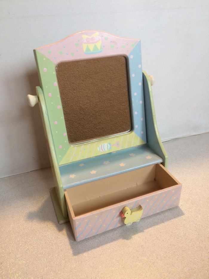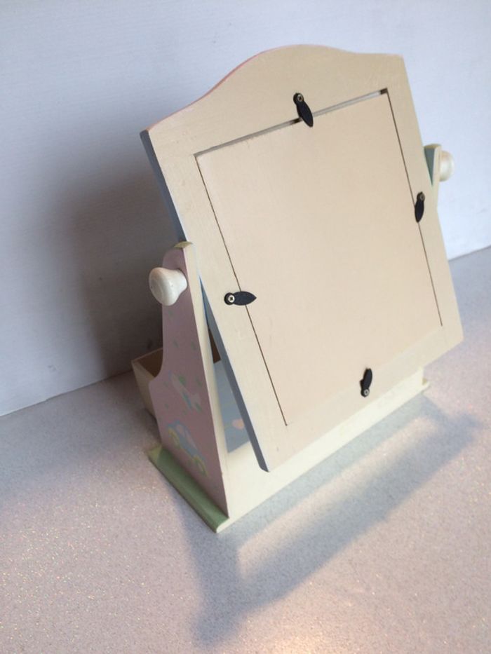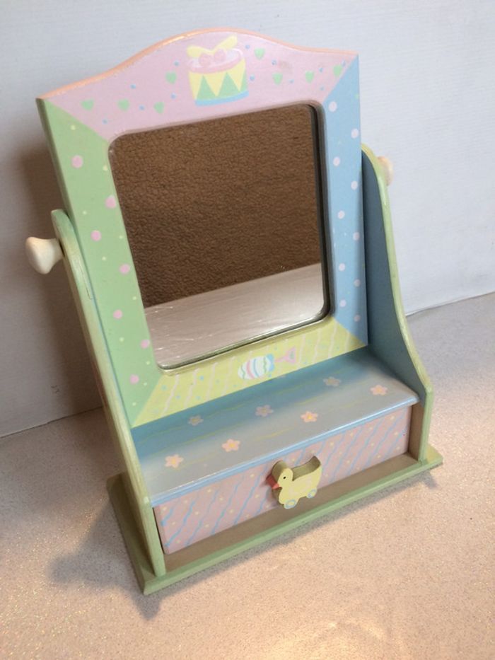 Notre fille ayant grandi et n’en ayant plus l’usage, nous vendons cette adorable petite coiffeuse en bois peint de couleurs pastelles. Le miroir est orientable, et le tiroir assez profond pour ranger tétines / barettes / bijoux etc… C’est une première main. Nous sommes une famille soignée et soigneuse, non fumeur et sans animaux. L’objet est en très bon état.