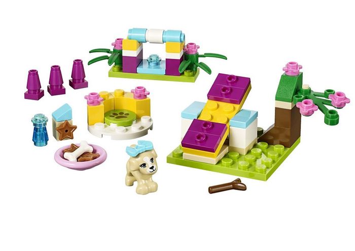 Adorable ensemble intitulé « le dressage de chiot » comprenant bien évidemment un petit chien, sa maîtresse, une niche et des accessoires de jeux pour l’animal. Votre enfant va pouvoir s’imaginer emmener le chiot sur le parcours de dressage ! L’aider à courir entre les cônes et à faire la course vers la balançoire. Puis le regarder courir et sauter facilement par-dessus la barrière mobile. Lancer le bâton au chiot et quand il le rapporte, remplir le bol d'eau et lui donner une récompense. Après tous ces efforts, le chiot a bien mérité une sieste dans son lit confortable !