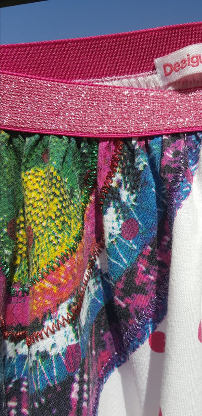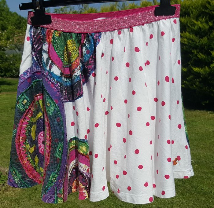 Cause pic de croissance de ma fille, nous vendons cette jupe de la célèbre marque DESIGUAL connue pour son originalité et le soin apporté au design comme aux détails. Cette jupe remarquable a une très jolie forme évasée avec de l’ampleur au bas de la jupe (qui tourne bien !) tandis que la taille est élastiquée. La ceinture est un élastique rose fushia pailleté du même coloris que les pois de la jupe. Le nom de la marque imprimé en bas de la jupe et de gros motifs géométriques répartis asymétriquement sur la jupe ajoutent à l’originalité de l’ensemble, soulignés par des fils métallisés. Confortable, cette jupe peut faire aussi bien très habillée portée avec un haut élégant, que décontractée portée avec un haut rock. 100% coton Lavage 30° Nous sommes une famille soignée et soigneuse, sans animaux ni fumeur. La jupe est vendue en parfait état. Vous pouvez voir les nombreux autres articles de qualité que nous mettons en vente Elle est à venir chercher à Saint-Vrain, avec un paiement en espèces exclusivement, et sans négociation possible, ou peut vous être envoyée (frais de port à votre charge) avec un paiement par chèque ou un virement