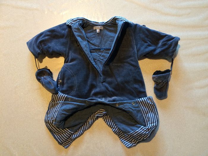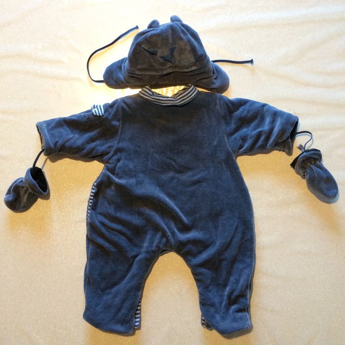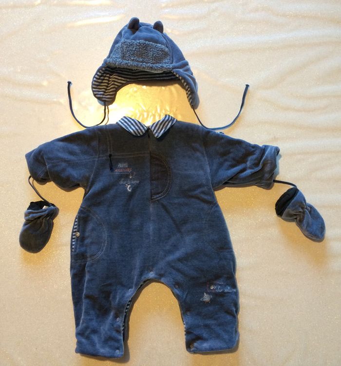 Bonjour Nous vendons cette très belle combinaison NATALYS très chaude, toute douce et en parfait état, accompagnée des moufles et du bonnet assortis. C'est une première main, exclusivement porté par mon fils pendant ses premiers mois ; maison non fumeur et sans animaux. Nombreux détails travaillés et originaux comme pour chaque article NATALYS : Petites poches décoratives latérales, découpe de tissu contrastant devant, surpiqûres, étiquette... Broderies évoquant un voyage galactique. Col façon col de chemise en tissu à rayures, que l'on retrouve sur le rabat de la poche sur le bras, mais aussi dans l'intérieur du bonnet. Tissu velours très doux et souple entièrement doublé. L'intérieur est en coton. Combinaison pratique puisqu'elle s'ouvre par zip et zone pressionnée à l'entre-jambes. Le bonnet à oreillettes est très doux, bien chaud, et facile à nouer avec des liens souples. Il est entièrement doublé. fausse fourrure sur le devant. petites oreilles sur le haut pour un effet très charmant. Les moufles sont assorties, sans découpe pour les doigts, donc faciles à enfiler. Elles sont doublées et reliées l'une à l'autre par un long lien identique à celui nouant les oreilles du bonnet. C'est un ensemble combinaison de grande qualité, bien chaude, très sympa, et en parfait état. Le prix est non négociable, et payable en espèces uniquement, contre remise en mains propres. L'envoi est possible contre paiement préalable en chèque. Frais de port à la charge de l'acheteur. Je précise que nous avons également à la vente de nombreux autres articles de grandes marques, pour garçon comme pour fille, du 0 au 16 ans : me contacter pour plus de précisions. Contacts exclusivement par écrit s'il vous plait. merci !