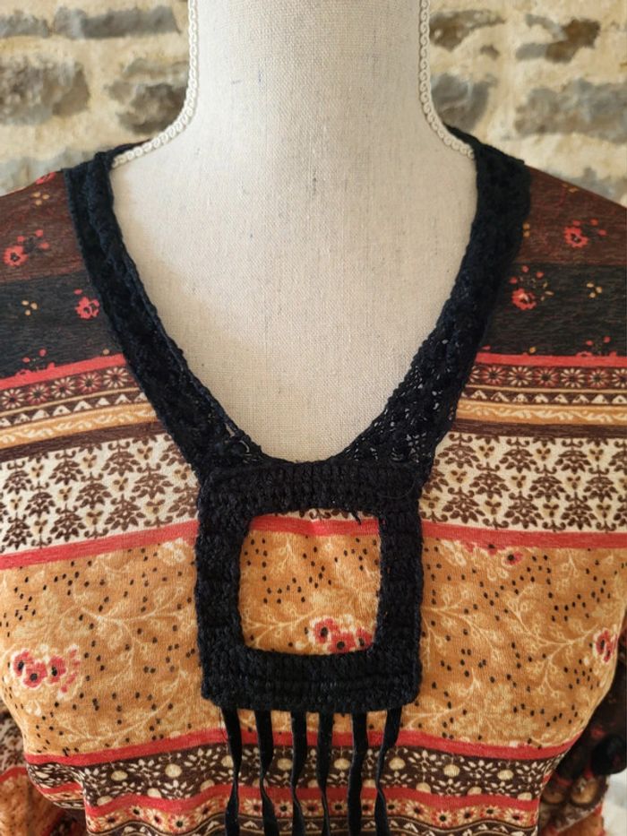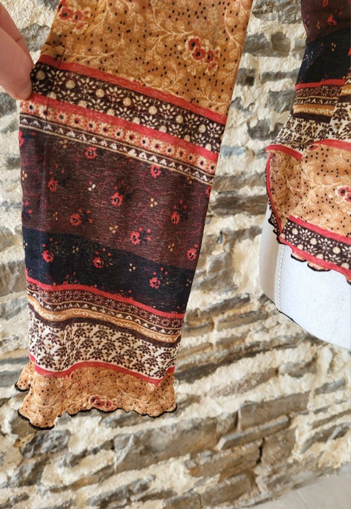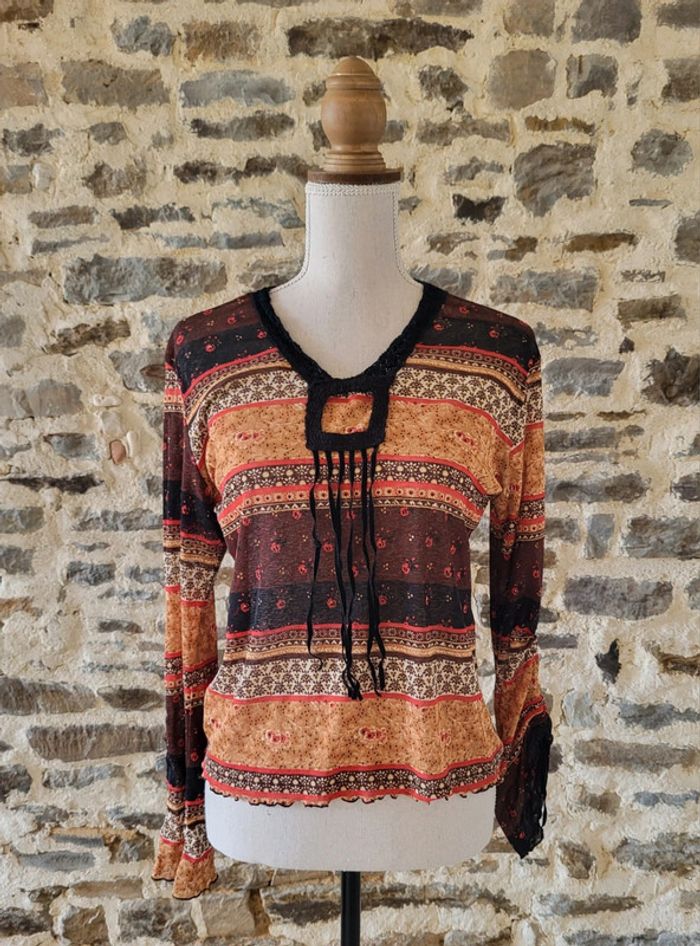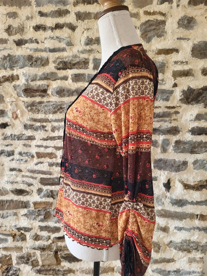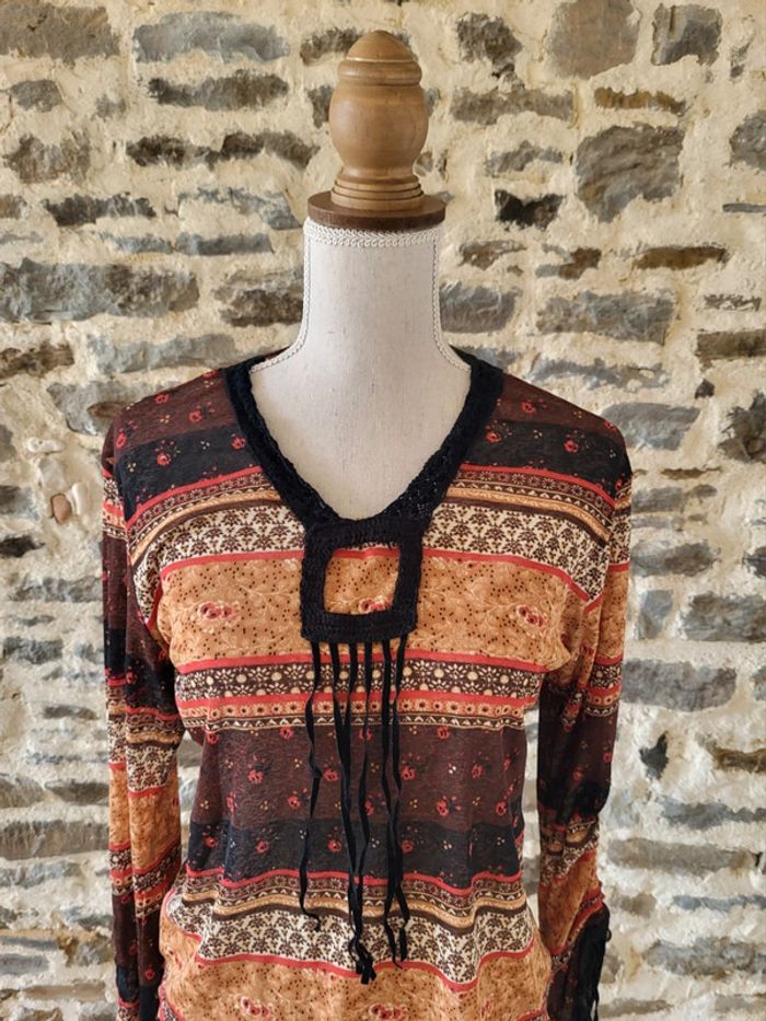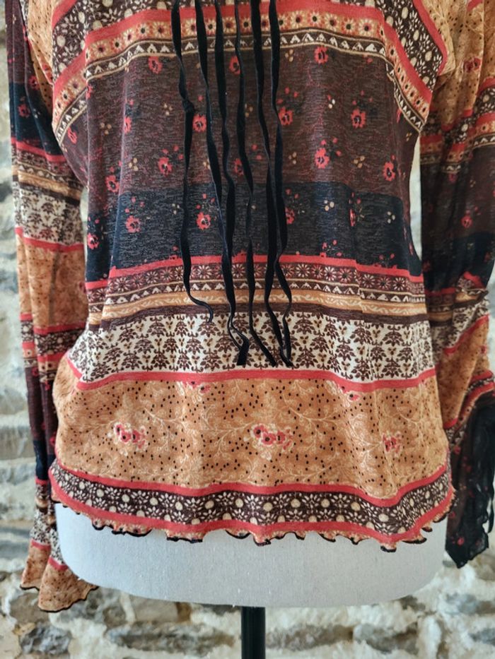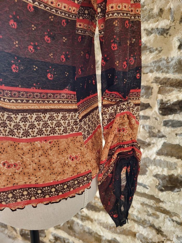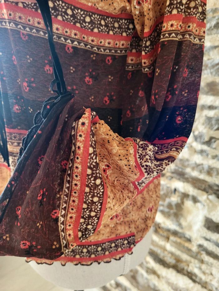 Très jolie blouse fine manches longues tons de marron noir rouille orangée Mia Soana Taille 2 ou 36 Peu portée, encore très bien Manches ajustables avec un lien à retrousser #matka27_taille38 #taille38 #blouse #marron #rouille #orange #miasoana