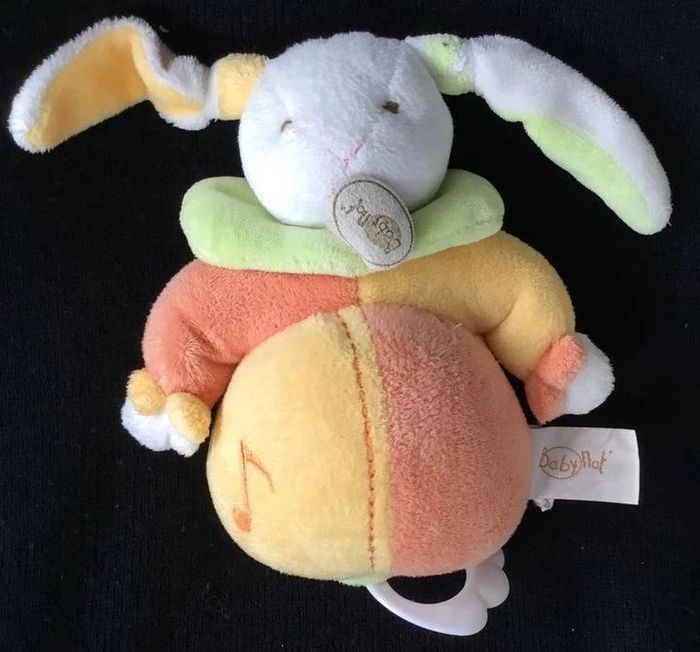 PELUCHE LAPIN MUSICAL EN VELOURS DE COULEUR JAUNE ET ORANGE SUR LE DEVANT EST BRODEE UNE NOTE DE MUSIQUE COLERETTE VERTE AU NIVEAU DU COU TIRER SUR L'ANNEAU EN PLASTIQUE DU DESSOUS POUR DECLENCHER UNE DOUCE MELODIE ETAT PARFAIT !