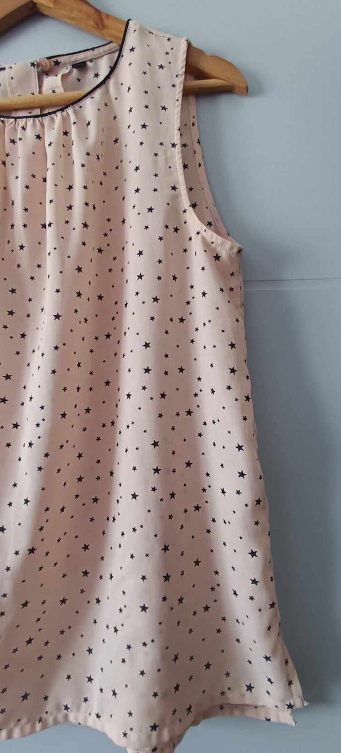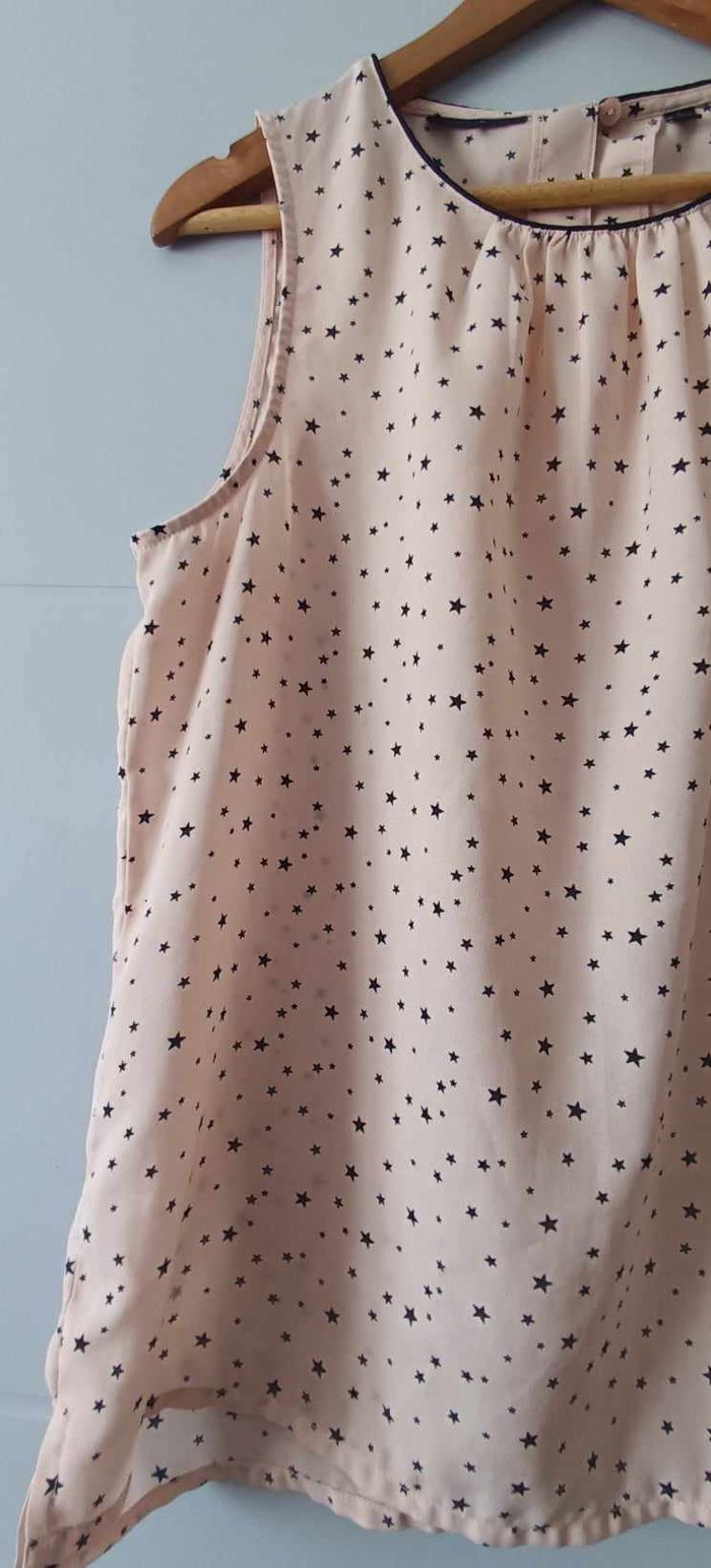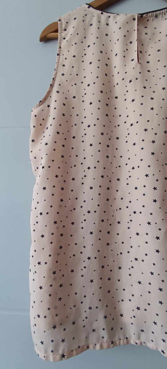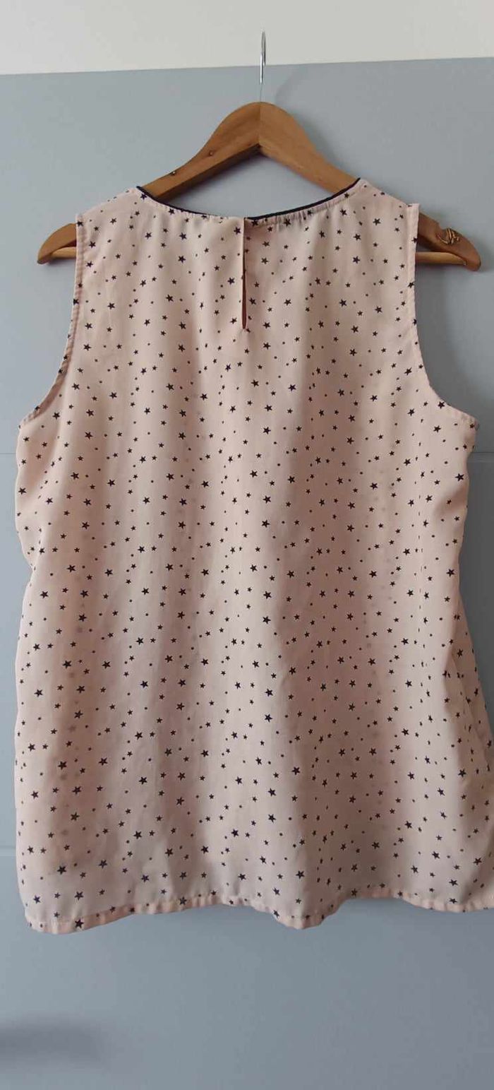 🔸Taille L 🔸Col rond 🔸Sans manches 🔸Plissée 🔸Ouverture dans le haut du dos avec bouton 🔸Couleur abricot et motifs "étoile" 📏Mesures prises à plat : ➡️D'une aisselle à l'autre 54 cm ➡️Longueur 66 cm 🧾Composition : ➡️100 % Polyester 🔸Article en très bon état avec une légère imperfection de la matière (voir dernière photo)