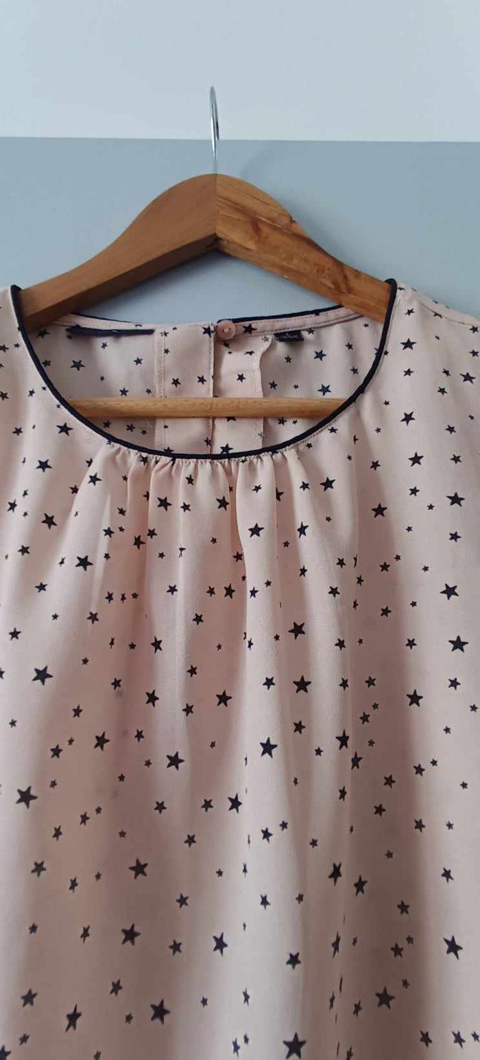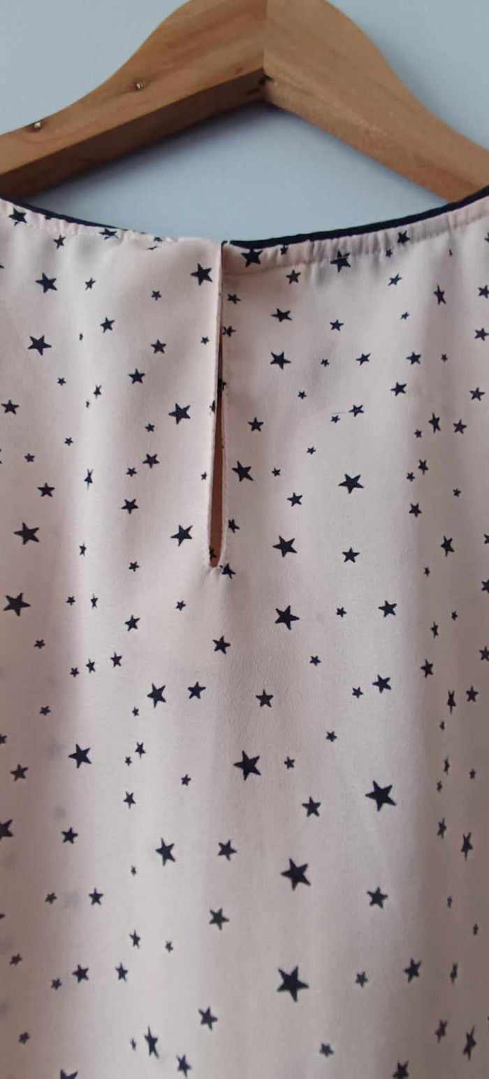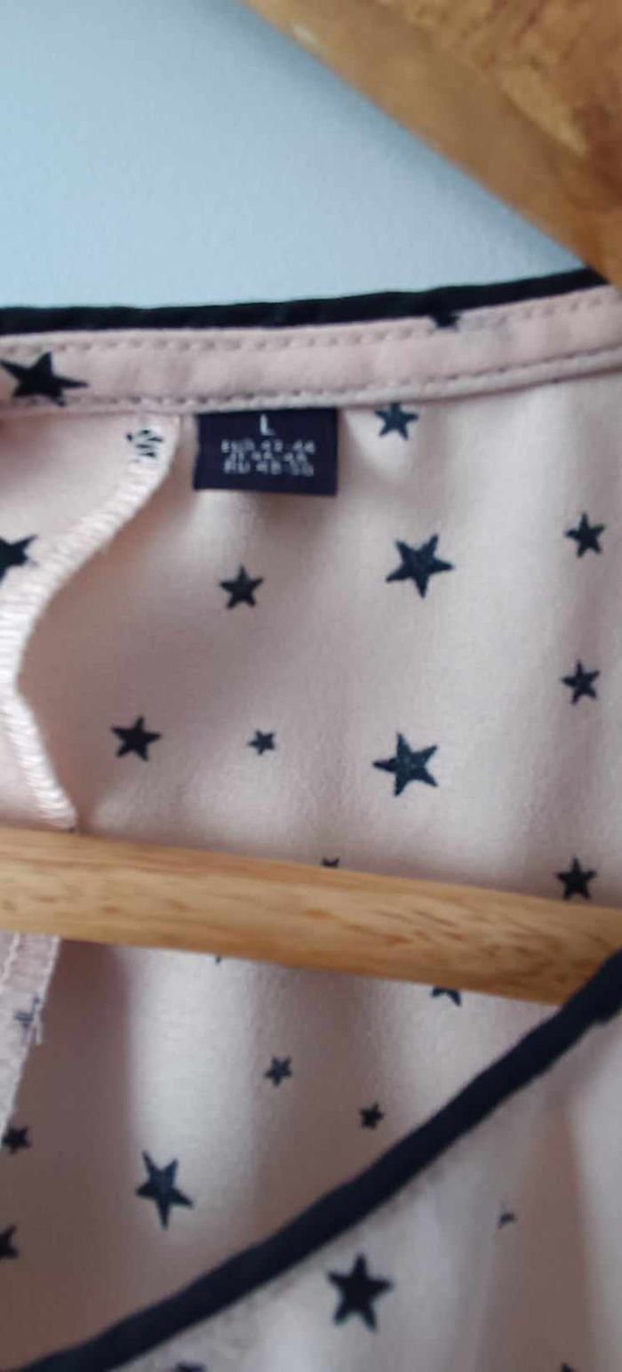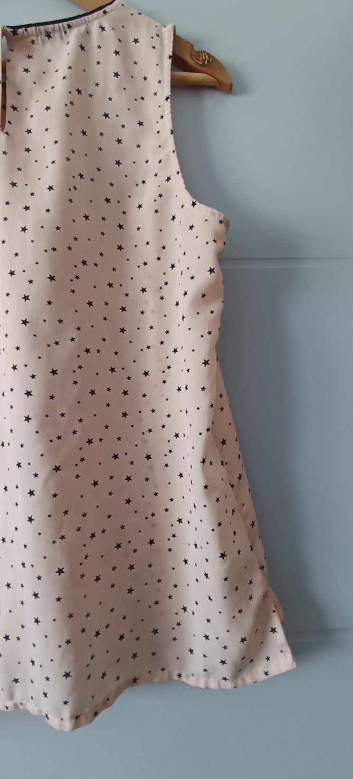 🔸Taille L 🔸Col rond 🔸Sans manches 🔸Plissée 🔸Ouverture dans le haut du dos avec bouton 🔸Couleur abricot et motifs "étoile" 📏Mesures prises à plat : ➡️D'une aisselle à l'autre 54 cm ➡️Longueur 66 cm 🧾Composition : ➡️100 % Polyester 🔸Article en très bon état avec une légère imperfection de la matière (voir dernière photo)