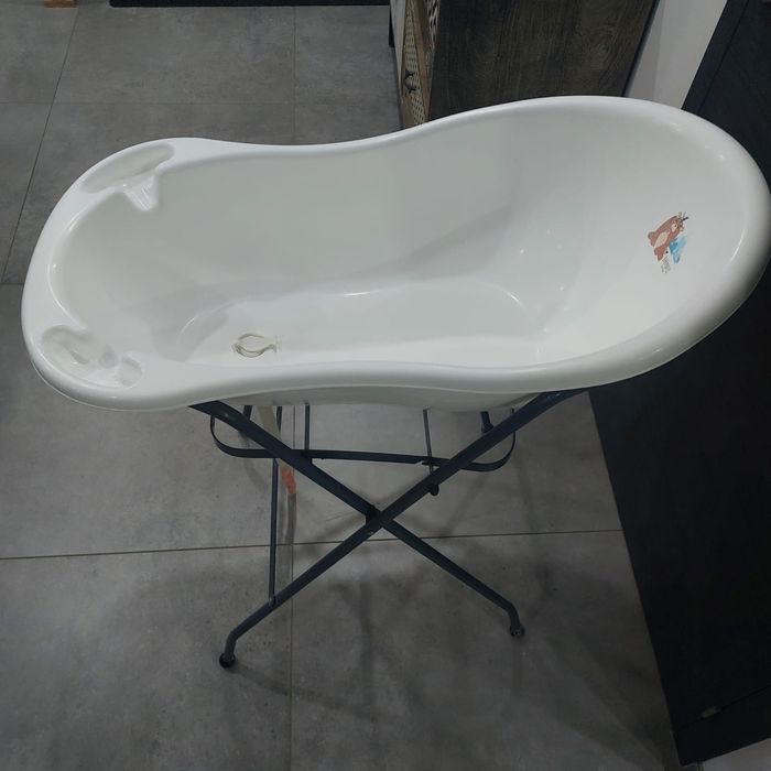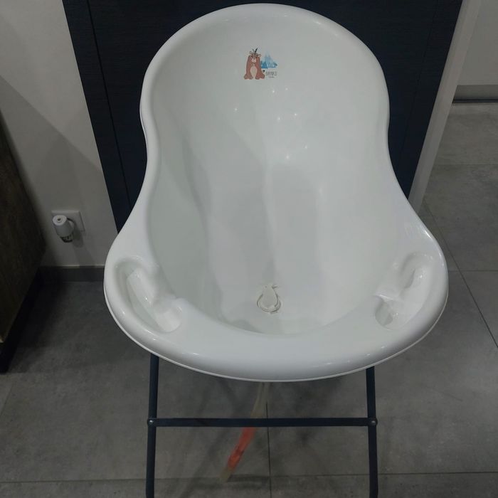 Baignoire bébé sur pied avec son siège de bain Vendu avec un siège de bain supplémentaire : en tissus La baignoire est en bon état. La peinture sur les pieds est légèrement abîmée