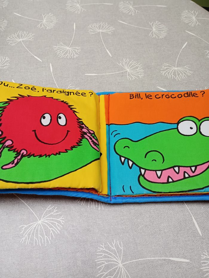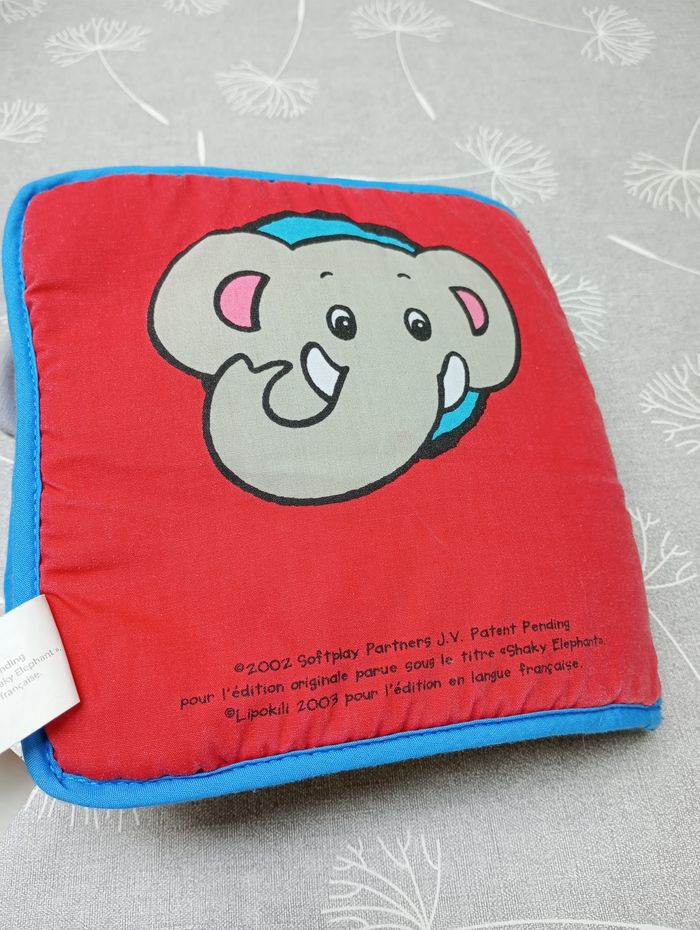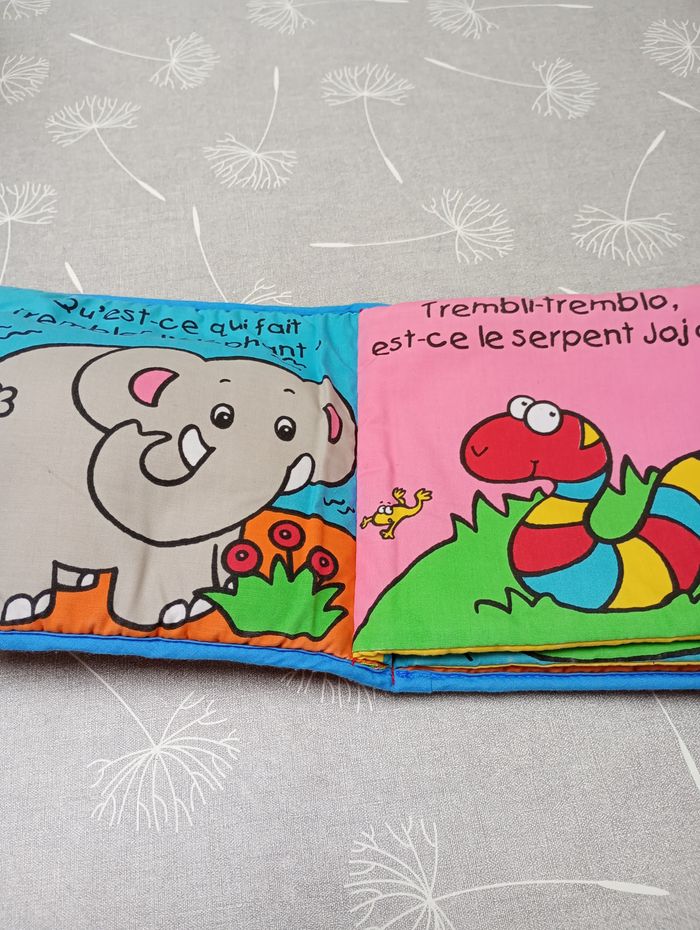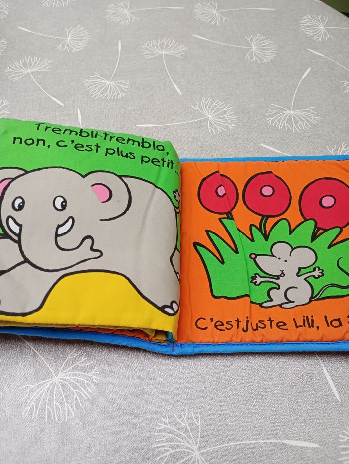 Livre "Trembli-Tremblo". Tire sur la trompe de l'éléphant et le livre tremble. Marque : Lipokili. Très bon état.