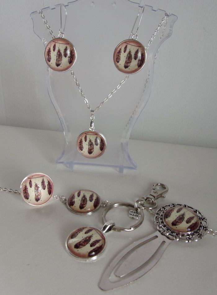 Parure complète 6 pièces cabochons 2cm "Plumes" La parure se compose: d'une bague: le cabochon en verre (diamètre 2cm) est collé sur un support de bague ouvert (donc ajustable) en métal argenté brillant. Diamètre de la bague 2,2cm d'un collier: le cabochon est collé sur un support (hauteur: 2,6cm, largeur: 2,3cm) en métal argenté brillant. Le support est monté sur bélière sur une chaîne à petits maillons en métal argenté brillant et possède une chaîne d’extension d’environ 5cm. Longueur : 44,5cm (longueur totale possible 49,5cm). d'une paire de BO dormeuses: le cabochon est collé sur un support (hauteur: 2,6cm, largeur: 2,3cm) en métal argenté brillant qui est monté sur une dormeuse 2,5cm. Hauteur totale de la BO : 4,8cm. d'un bracelet: le cabochon est collé sur un support (hauteur: 2,3cm, largeur: 2,9cm) en métal argenté brillant qui est monté sur une chaîne à petits maillons en métal argenté brillant et possède une chaîne d’extension d’environ 5cm. Longueur : 16,8cm (longueur totale possible 21,8cm). d'un porte clé: le cabochon est collé sur un support en métal argenté (hauteur: 3,2cm, largeur: 2,3cm) qui est monté sur un anneau (2,5cm) et un fermoir qui vous permet de l'accrocher. Hauteur totale du porte clé: 8,8cm d'un marque page trombone: Le cabochon est collé sur un support Argenté (hauteur: 8cm, largeur: 3cm) Chaque création est emballée individuellement