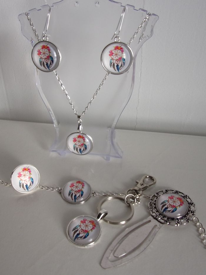 Parure complète 6 pièces cabochons 2cm "Pièges à Rêves" La parure se compose: d'une bague: le cabochon en verre (diamètre 2cm) est collé sur un support de bague ouvert (donc ajustable) en métal argenté brillant. Diamètre de la bague 2,2cm d'un collier: le cabochon est collé sur un support (hauteur: 2,6cm, largeur: 2,3cm) en métal argenté brillant. Le support est monté sur bélière sur une chaîne à petits maillons en métal argenté brillant et possède une chaîne d’extension d’environ 5cm. Longueur : 44,5cm (longueur totale possible 49,5cm). d'une paire de BO dormeuses: le cabochon est collé sur un support (hauteur: 2,6cm, largeur: 2,3cm) en métal argenté brillant qui est monté sur une dormeuse 2,5cm. Hauteur totale de la BO : 4,8cm. d'un bracelet: le cabochon est collé sur un support (hauteur: 2,3cm, largeur: 2,9cm) en métal argenté brillant qui est monté sur une chaîne à petits maillons en métal argenté brillant et possède une chaîne d’extension d’environ 5cm. Longueur : 16,8cm (longueur totale possible 21,8cm). d'un porte clé: le cabochon est collé sur un support en métal argenté (hauteur: 3,2cm, largeur: 2,3cm) qui est monté sur un anneau (2,5cm) et un fermoir qui vous permet de l'accrocher. Hauteur totale du porte clé: 8,8cm d'un marque page trombone: Le cabochon est collé sur un support Argenté (hauteur: 8cm, largeur: 3cm) Chaque création est emballée individuellement