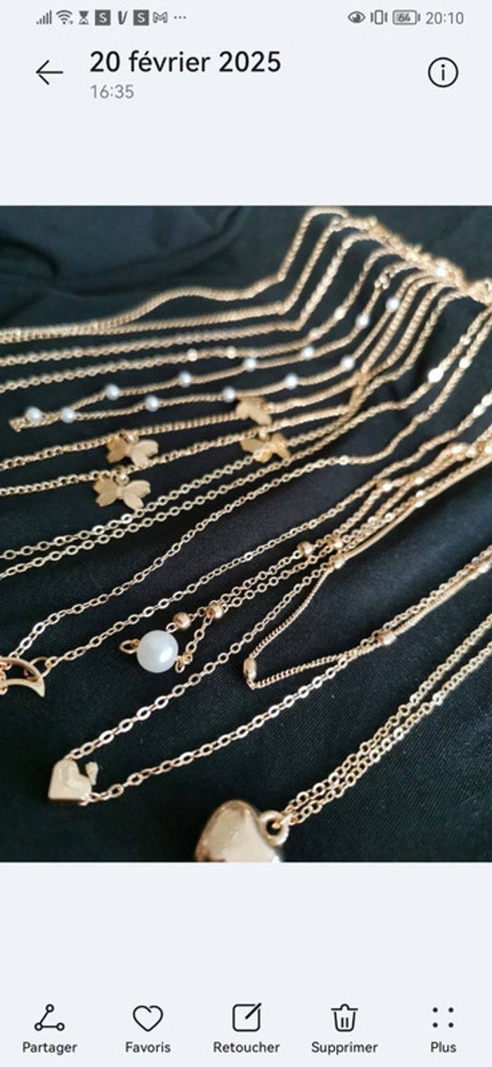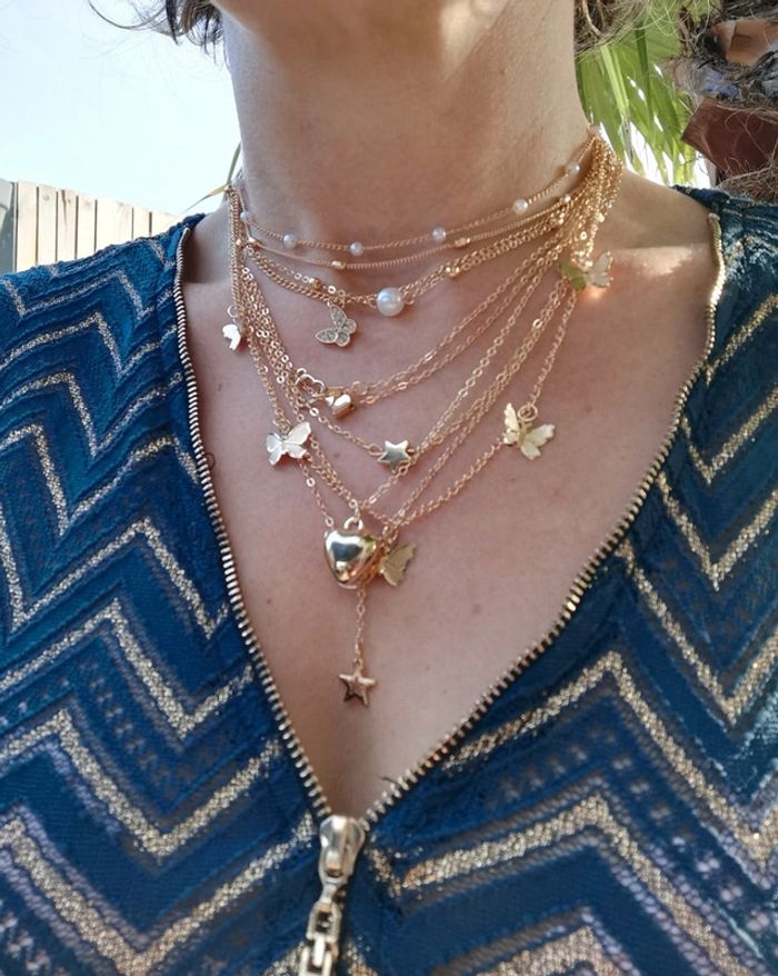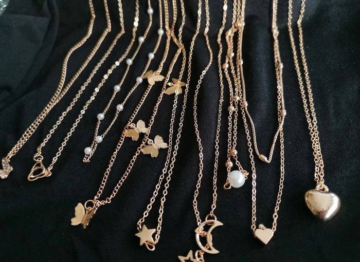 Lot de 10 collier chaîne doré or tendance réglable. Jamais porté #bijou #bijouxfantaisie #bijouxfemme #retrofashion #fashion #style #accessoriesfemme #accessoires #jollas #jewelleryset #lot #lotbijou#cadeau #set#setbijoux #collier #lotbijou #jewelsset #boho #boheme