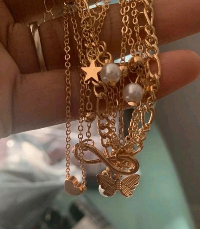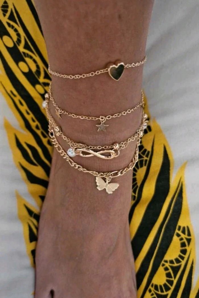 Lot de 4 bracelet gourmette chevillere doré or tendance réglable. Jamais porté #bijou #bijouxfantaisie #bijouxfemme #retrofashion #fashion #style #accessoriesfemme #accessoires #jollas #jewels #pulsera #pulseramujer #modern #chevillere #pulsera #pulseramujer #mode #modefemme #lotbijou #jewelsset
