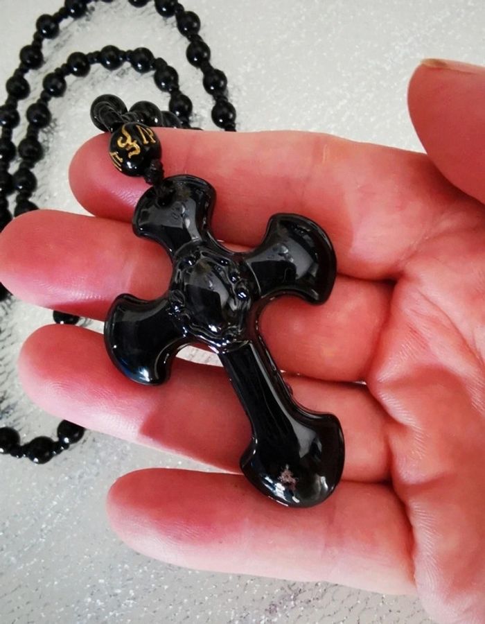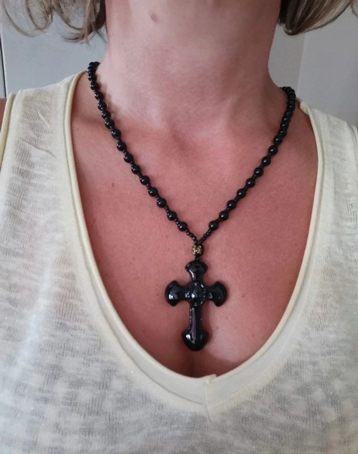 Collier pendentif croix verre noir gothic. Jamais porté #bijou #bijouxfantaisie #bijouxfemme #retrofashion #fashion #fantaisie #boho #boheme #bohemechic #jewels #jewerly #style#accessoriesfemme #accessoires #jollas #crucifix #bijoucroix #christ #accessories #accessoirefemme #accessoirehomme#cadeau