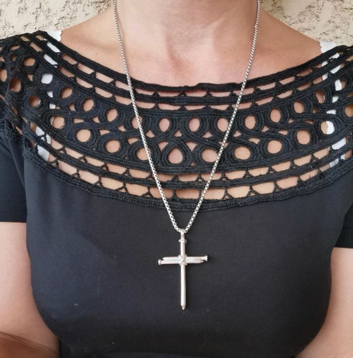 Collier chaîne pendentif croix acier inoxydable chromé argenté. Pendentif 5cm chaîne 60cm. Jamais porté. #bijou #bijouxfantaisie #bijouxfemme #retrofashion #fashion #style #accessoriesfemme #accessoires #jollas#jewels #croix #crucifix #bijoucroix #christ #accessoirehomme #accessoirefemme #mode #modefemme #mode #designer #fashion
