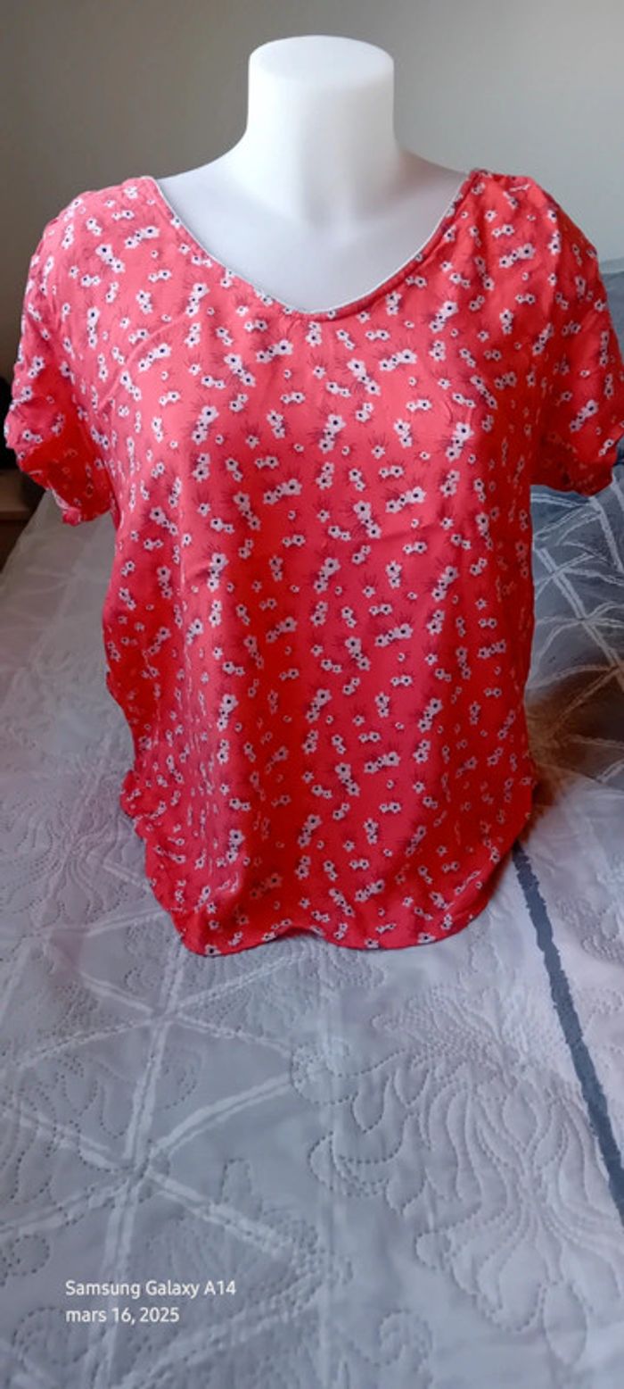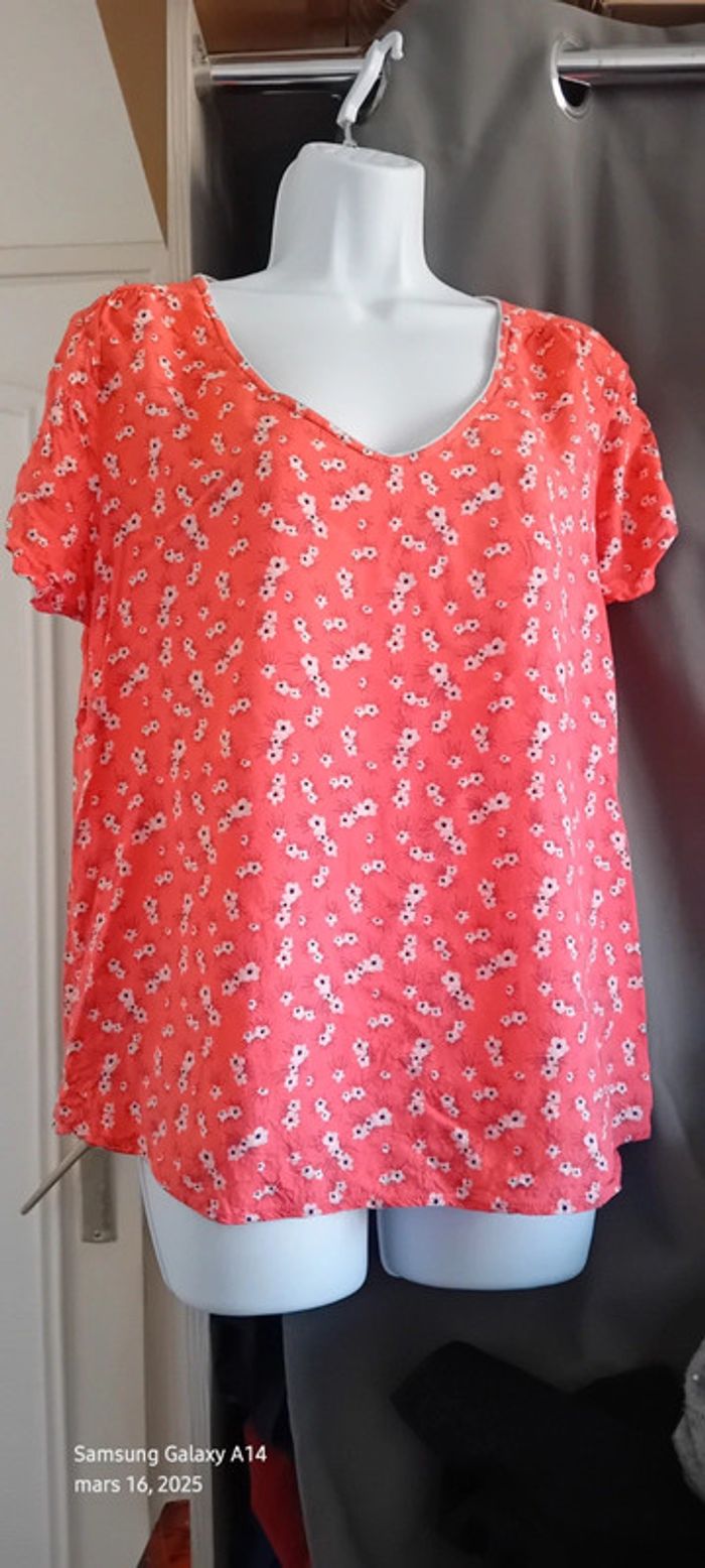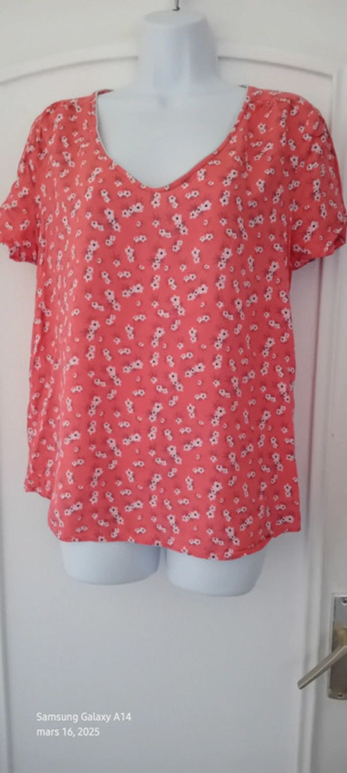 Haut col V motif floral corail femme 44 in extenso - photo numéro 14