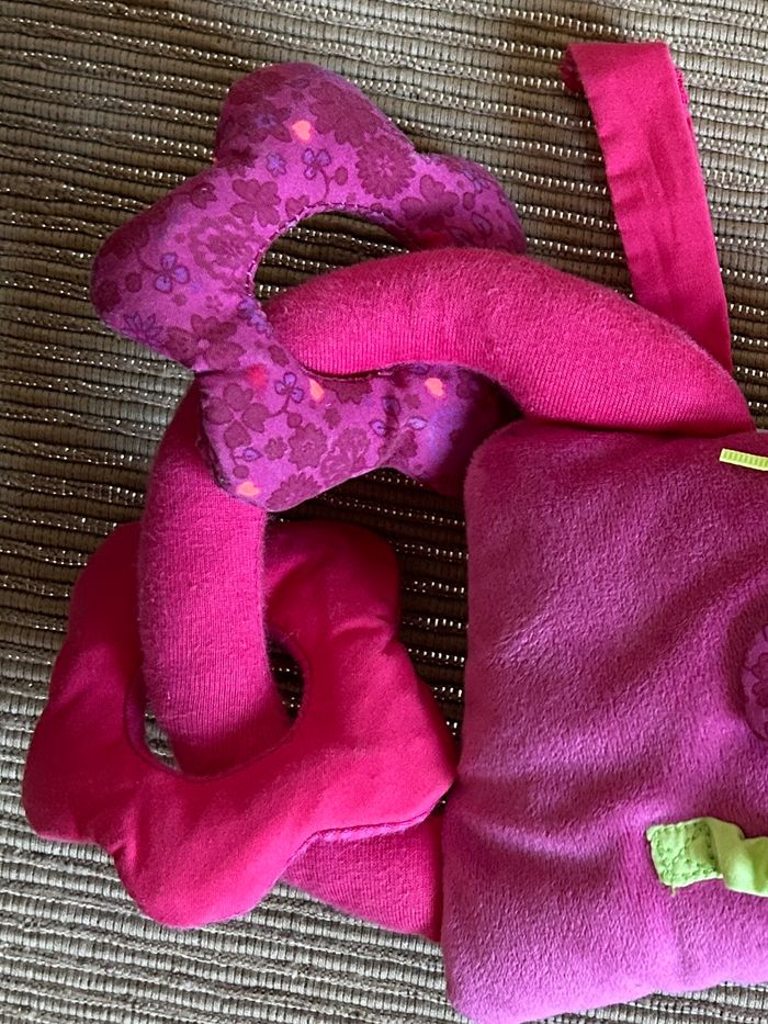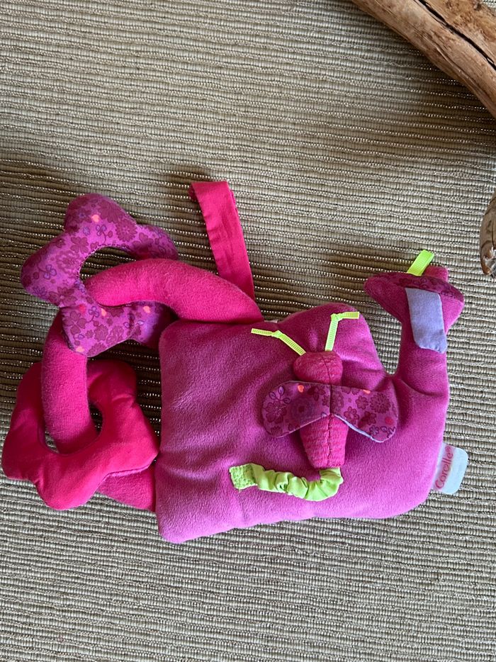 En très bon état Des textures variées, des sons, un élastique... il y a de quoi s'occuper ! Grâce à son lien, il peut se suspendre partout. 16x22 cm.