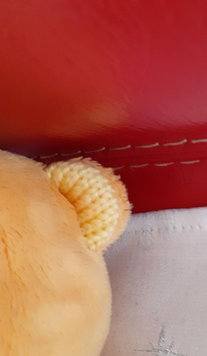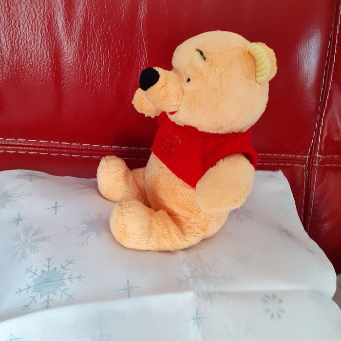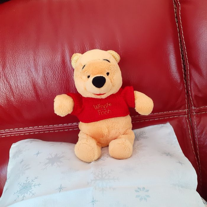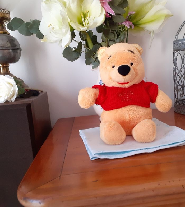 Peluche entièrement rembourrée; yeux brodés; pull non amovible avec inscription "Winnie the Pooh"; oreilles doublées; petites billes à l'intérieur pour faciliter la position assise ( ne tient pas debout) Hauteur totale de 27 cm // voir photos pour détails