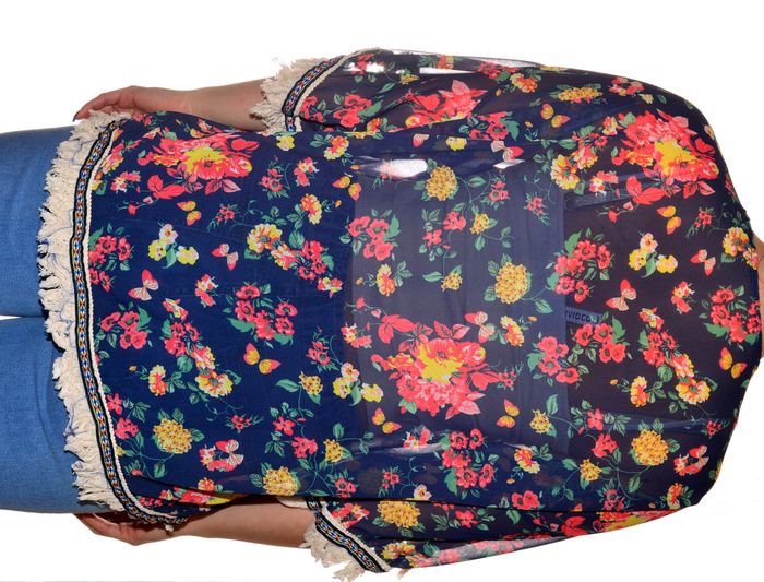 Cardigan/Boléro fin ouvert transparent d'été motif floral bleu marine manches 3/4 taille M - photo numéro 3