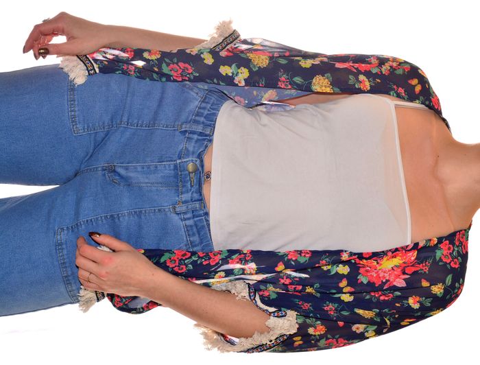 Cardigan/Boléro fin ouvert transparent d'été motif floral bleu marine manches 3/4 taille M - photo numéro 1