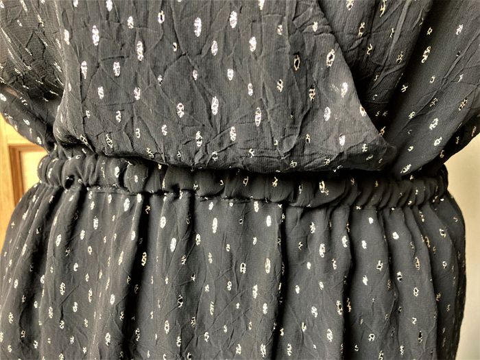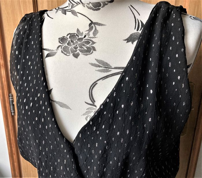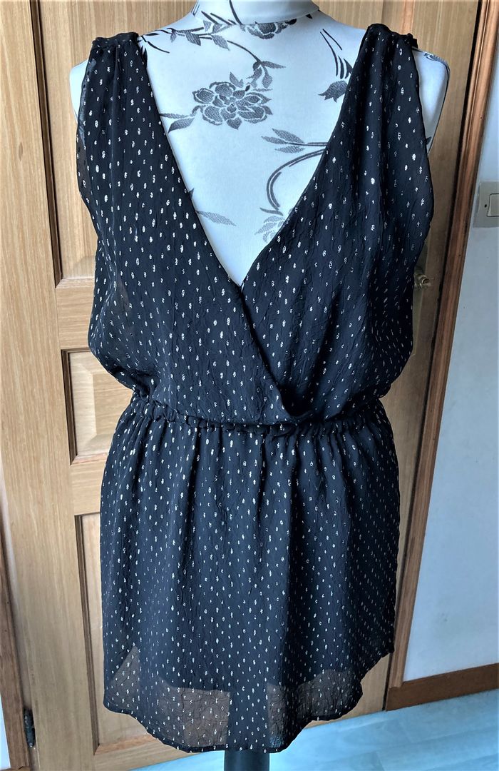 Marque "Mango", encolure et dos cache-coeur, taille élastiquée, voile doublé. Tour de poitrine 100 cm, longueur 83 cm.