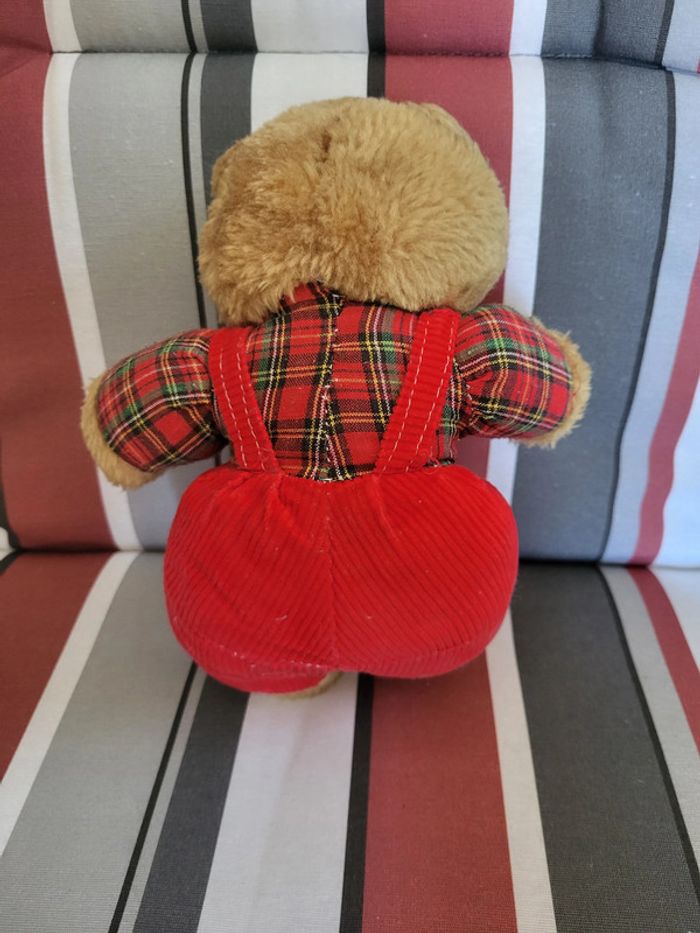 Peluche ourson marron salopette rouge tissu carreaux Marque Françoise Saget ? Prix de lot dès 2 peluches achetées #SILVERSYNjeux