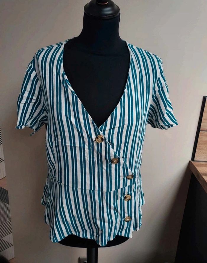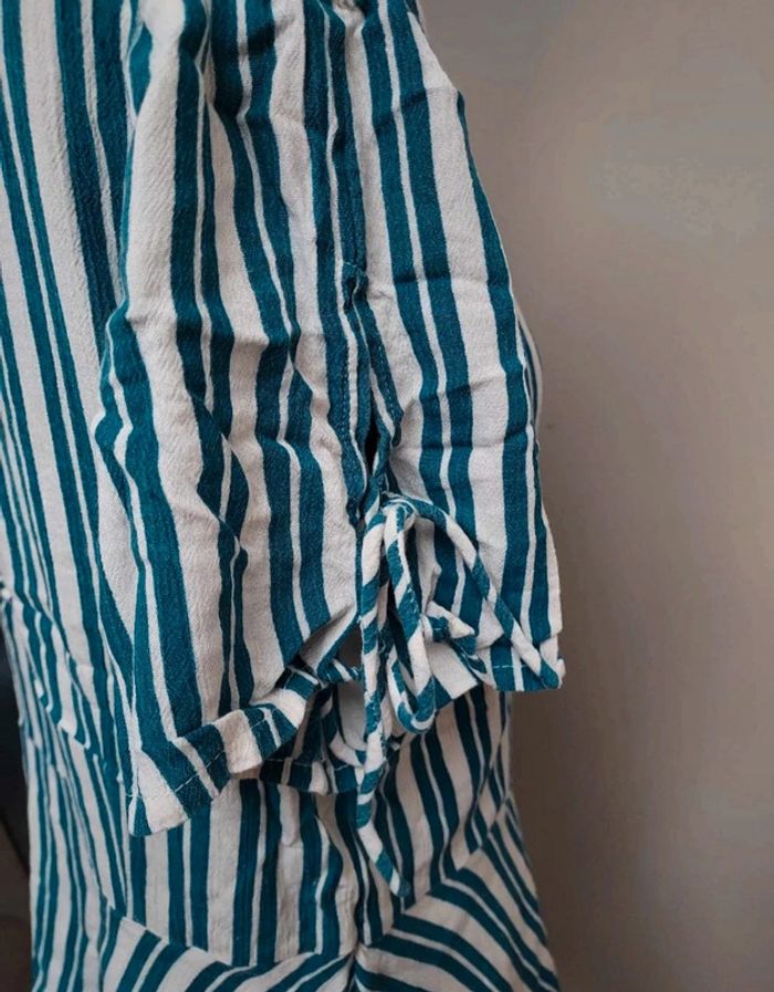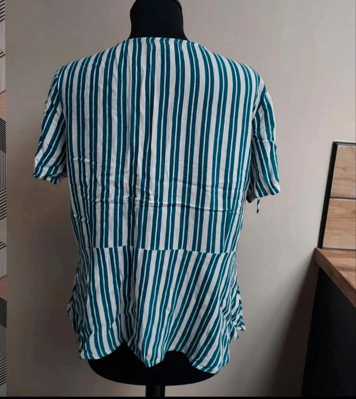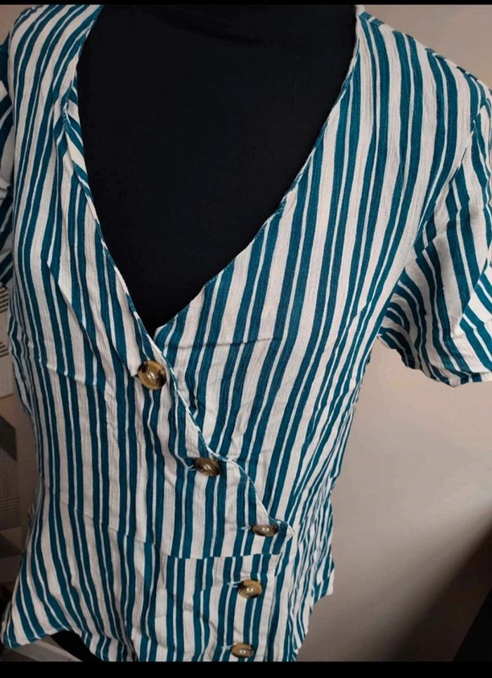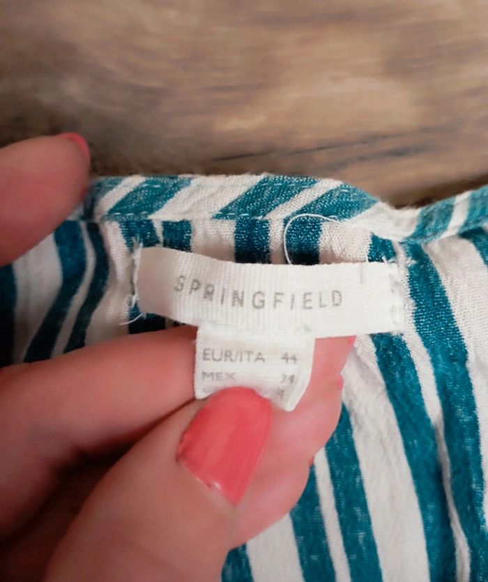 Couleur blanc et turquoise Boutonnée sur le devant Liens à noter aux manches Étiquette de composition coupée Matière très agréable pour le printemps-été Noté taille 44 mais convient plutôt pour une taille L 40 Réductions possibles sur lot sur demande #chemise #style #turquoise #springfield #springfieldfemme