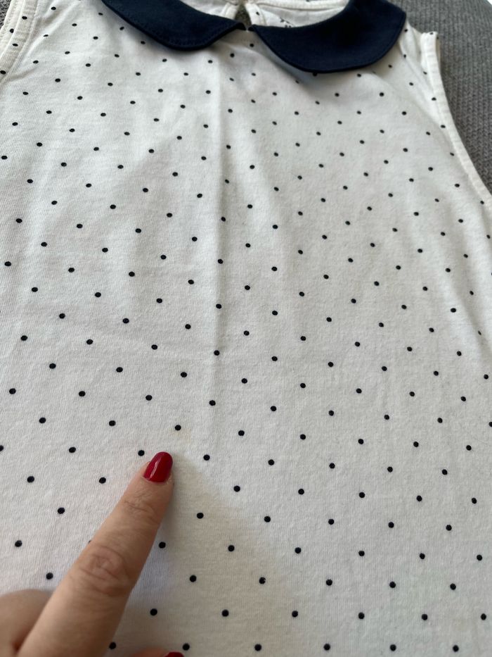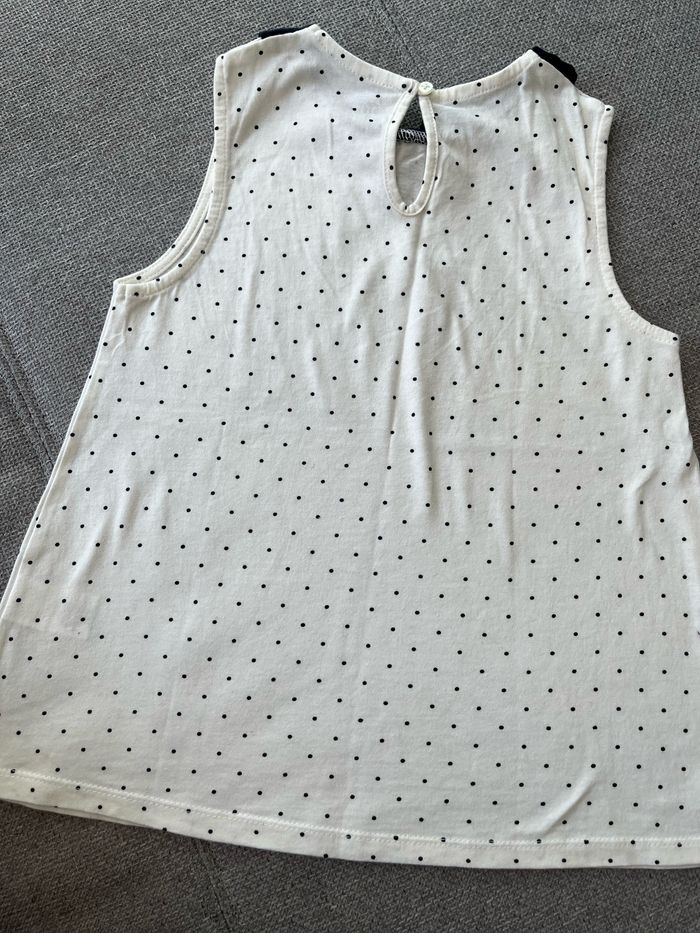 Top sans manches avec joli col Claudine La Redoute Taille 8 ans Blanc cassé à pois bleu marine À noter : une tâche peu visible à l’avant (voir photo)