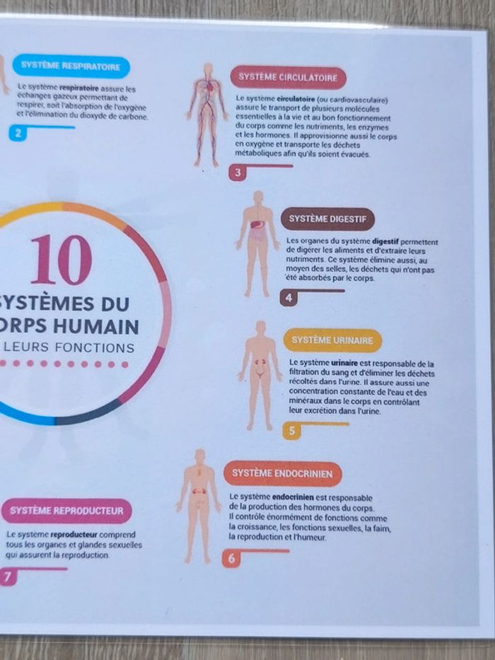 📍Fiche A4 des 10 système du corps humain et leurs fonctions. 📍Papier 250G plastifié pour une bonne tenue ! 📍Neuf. 👉Pour trouver d'autres activités c'est par ici : 🔎#elisabethdesignCorpsHumain 🔎#elisabethdesignAfficheA4 📫⏳ Envoi rapide et soigné le jour même de l'achat dans la mesure du possible! 🤝 Frais de port ajusté au plus bas. Ref : 7#-7b#-Anatomie