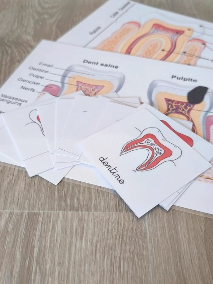 📍1 Véritable dentier articulé. 📍1 Véritable découpe de dents avec une carie. 📍Cartes de nomenclature. 📍1 fiche coupe de la dent avec légendes. 📍1 fiche coupe de la dent avec carie. 📍Papier 250G plastifié pour une bonne tenue ! 📍Neuf. 👉Pour trouver d'autres activités c'est par ici : 🔎#elisabethdesignCorpsHumain 📫⏳ Envoi rapide et soigné le jour même de l'achat dans la mesure du possible! 🤝 Frais de port ajusté au plus bas.
