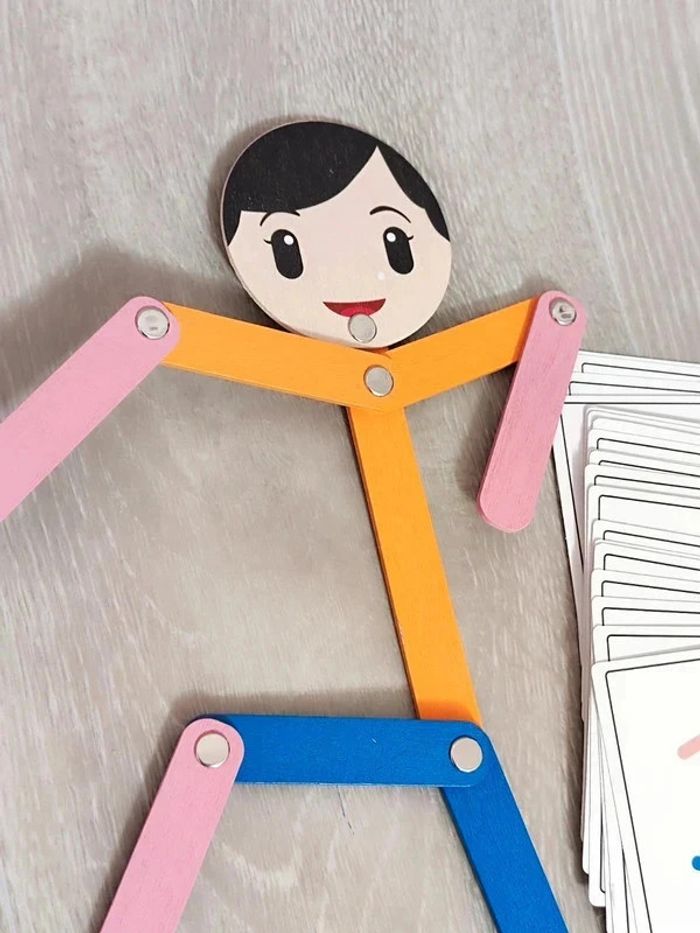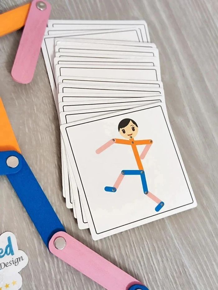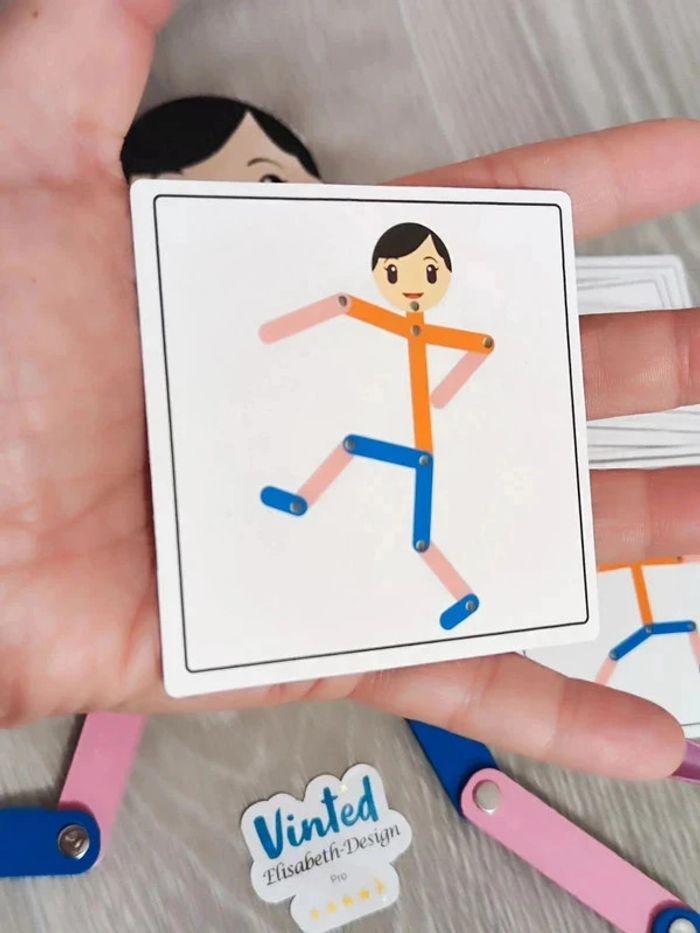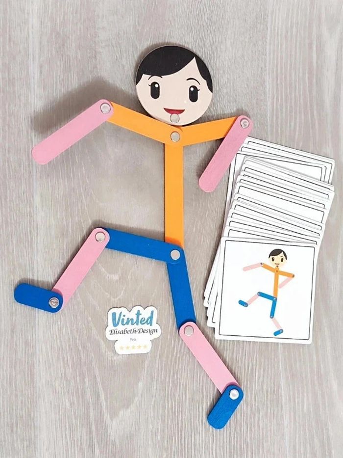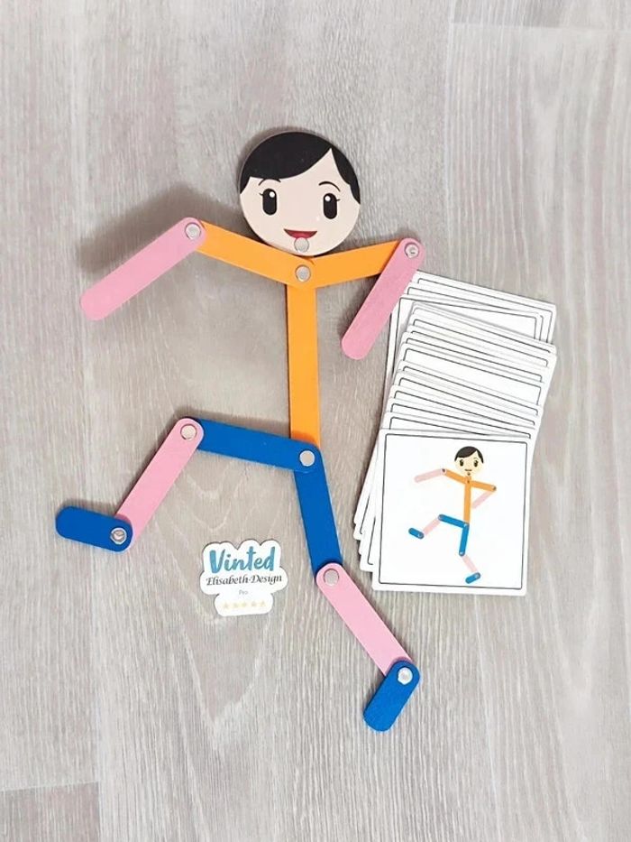 Jeu Neuf. 📍Le jeu est un outil d'entraînement et de développement des capacités cognitives de l'enfant. 📍Conçu pour stimuler la motricité fine et la coordination des mouvements, le jeu est composé de 24 cartes recto verso à sélectionner pour reproduire les figure sur le bonhomme en bois articulé, votre enfant pourra développer sa concentration et son habileté manuelle tout en s'amusant. 👉Pour trouver d'autres activités c'est par ici : 🔎#elisabethdesignJeuenBois 📫⏳ Envoi rapide et soigné le jour même de l'achat dans la mesure du possible! 🤝 Frais de port ajusté au plus bas.