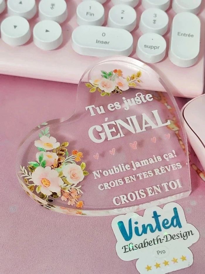 📍Plaque neuve. 📍Plaque cœur " Tu es juste génial " 📍Plaque cadeau. 📍Plaque en acrylique de 1 cm d'épaisseur. 📍Taille : 10 x 9 cm. 👉Pour trouver d'autres activités c'est par ici : 🔎#elisabethdesignCadeau 📫⏳ Envoi rapide et soigné le jour même de l'achat dans la mesure du possible! 🤝 Frais de port ajusté au plus bas.