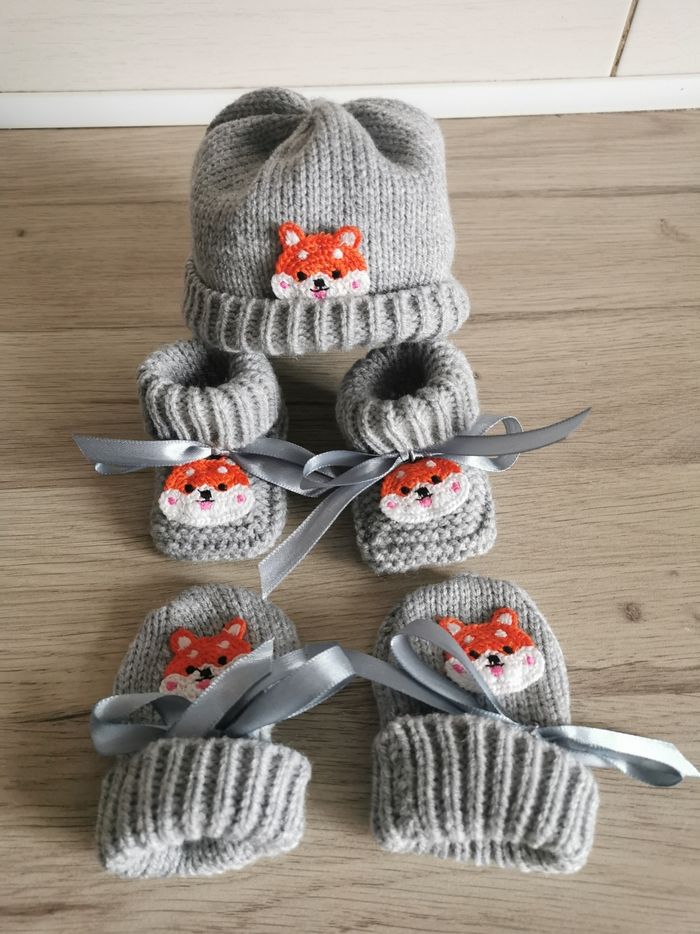 Ensemble bonnet chaussons et mouffles bébé fait par mes soins neuf