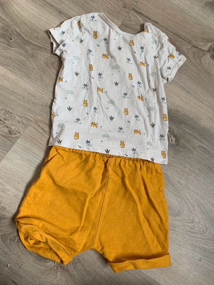 Ensemble avec t-shirt motif jungle et short moutarde Petit trou au niveau du haut du short (derrière)