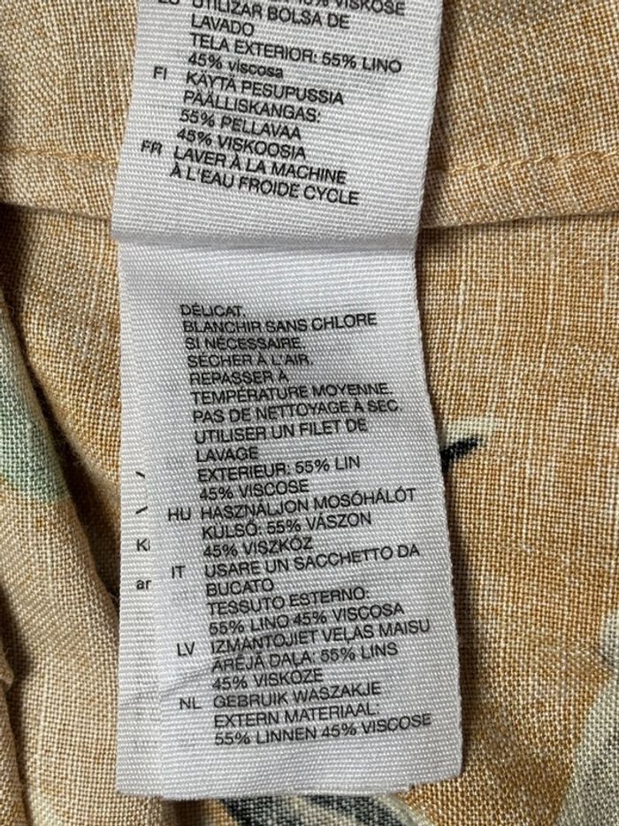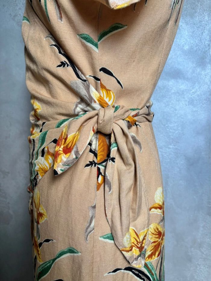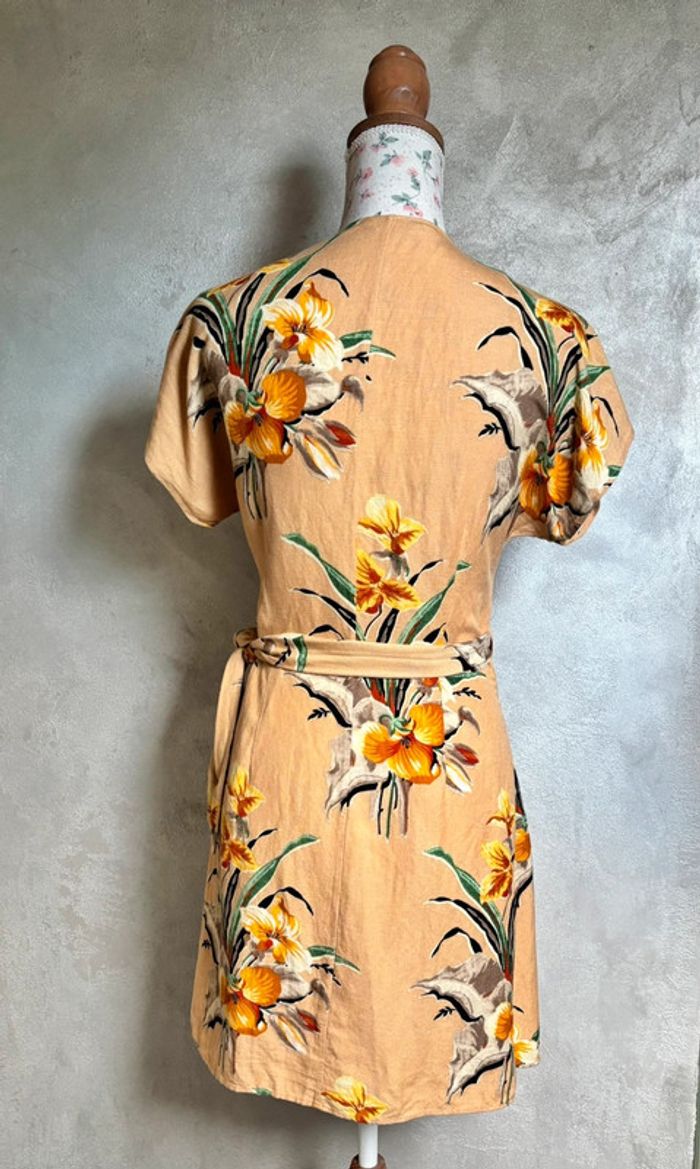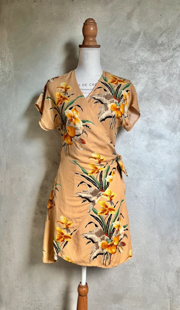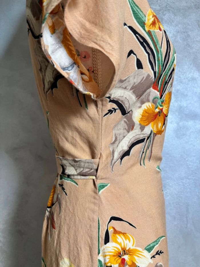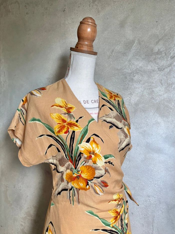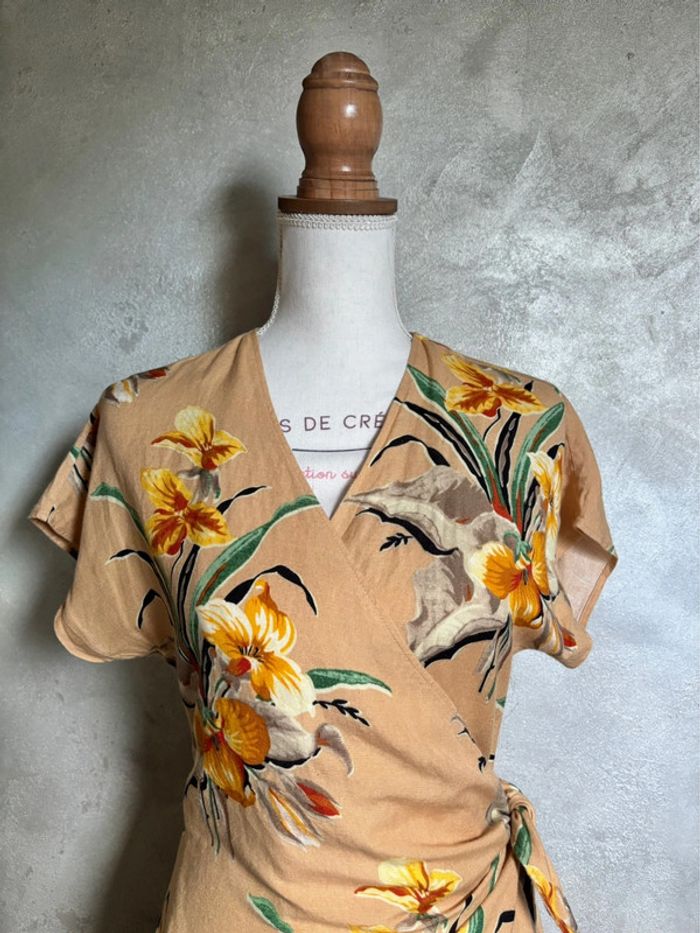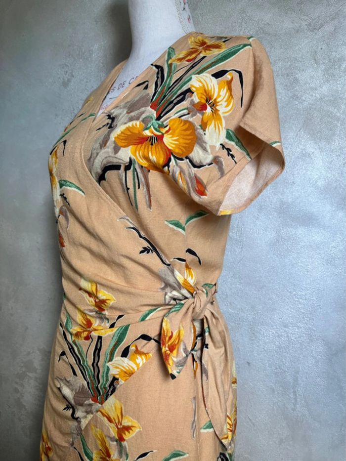 Robe porte feuille fond beige-jaune à fleurs jaune. ☀️ Croisement par l’intérieur et noeud à faire sur le côté inverse. Agréable à porter l’été grâce au lin que contient le tissus En très bon état. Taille : 34 Longueur : 82 cm Aisselles à aisselles : environ 38 cm Épaules : 37 cm 🌸 Envoi rapide 🎀 Colis soigné
