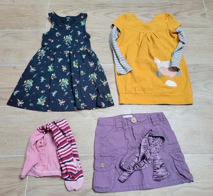 Lot 4 leggings, 1 robe d'été, 1 robe jaune ( présence d'une tache) et 1 jupe vuolette. Différentes marques #4ansfille_nolinera