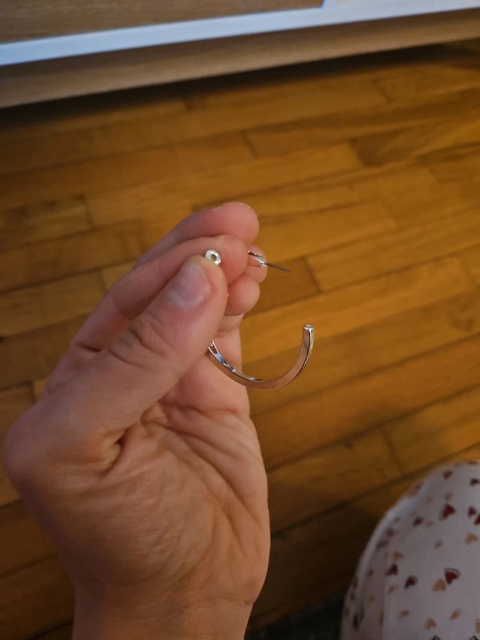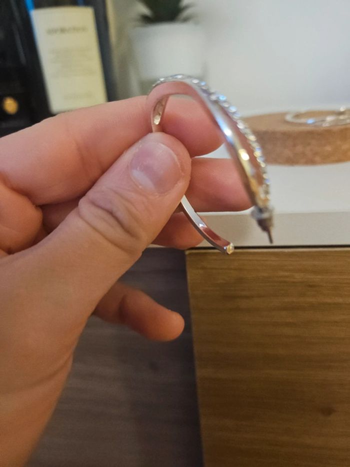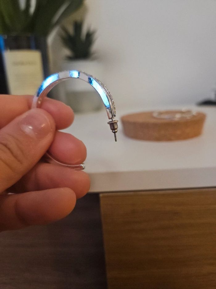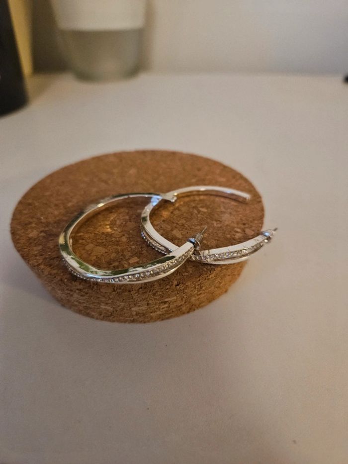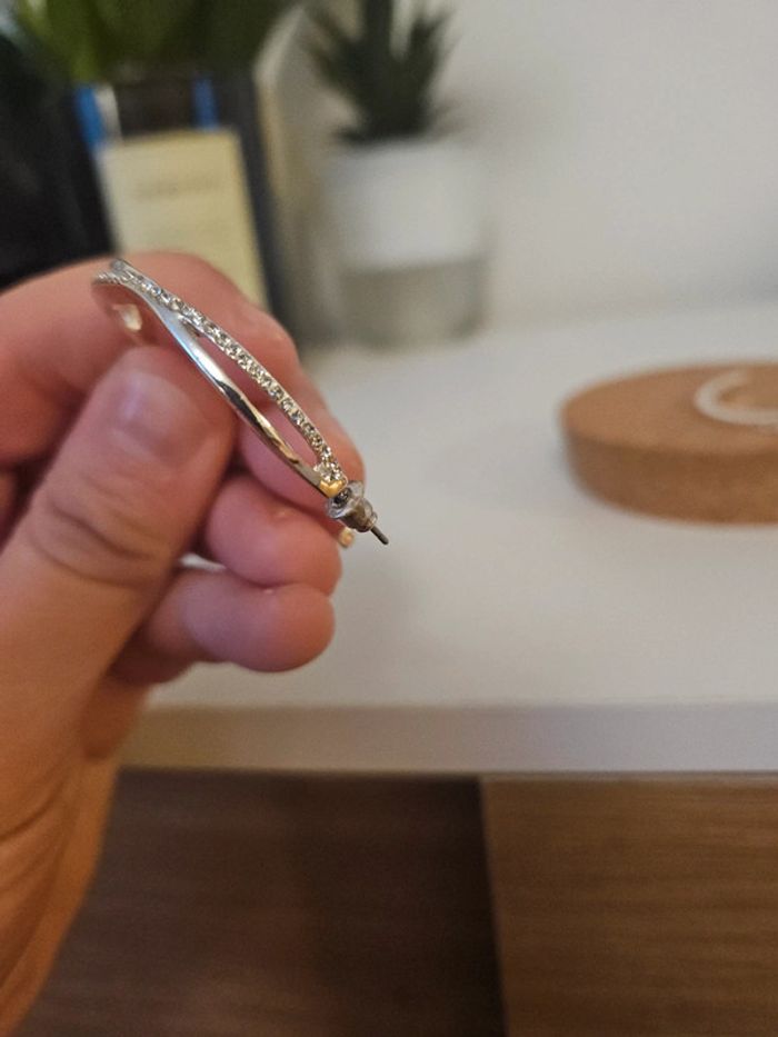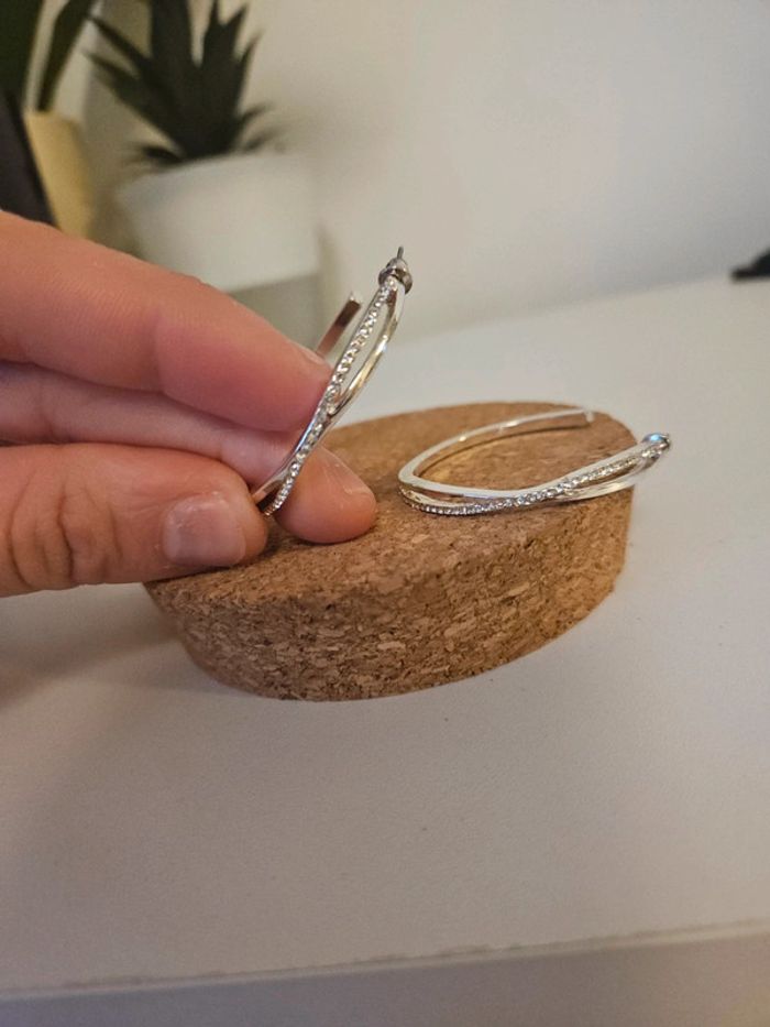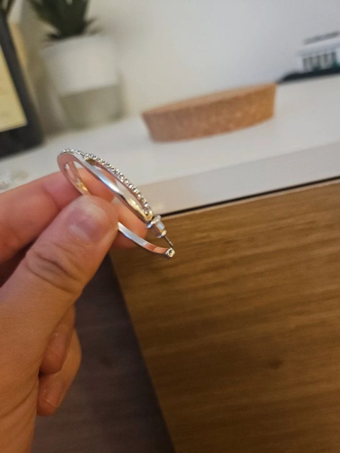 Boucles d'oreilles Type créoles Avec des faux strass Assez grosse Couleur argent ⚠️ Ce n'est ni de l'argent ni de l'acier inoxydable. Une des boucle est un peu abimé sur le côté (voir dernière photo) Les tiges sont noires mais je ne sais pas si c'est d'origine ou non comme on me les as offerte et je ne les ai jamais portée ce n'est pas mon style Il ne manque pas de strass