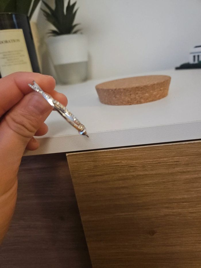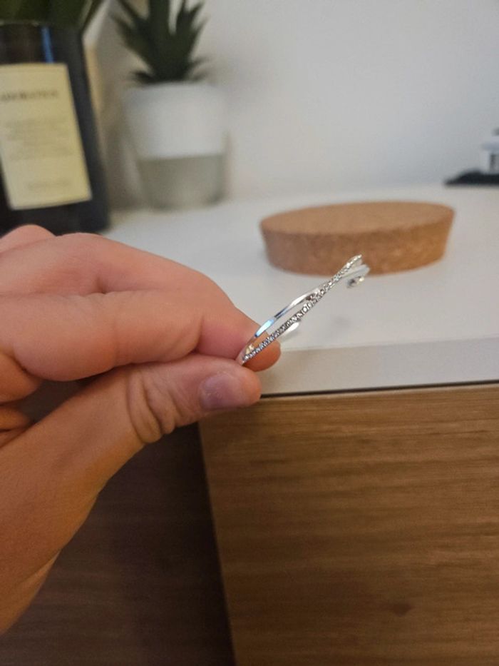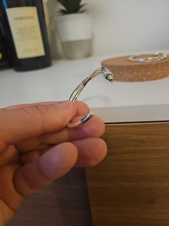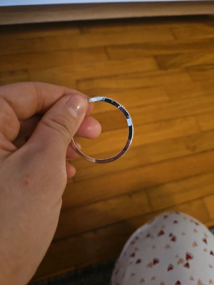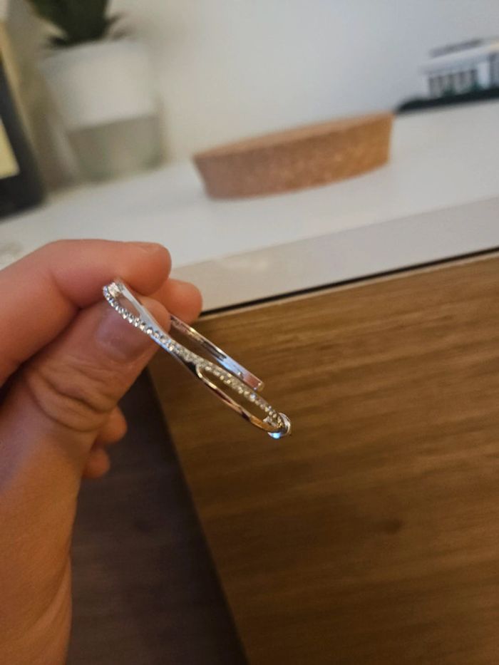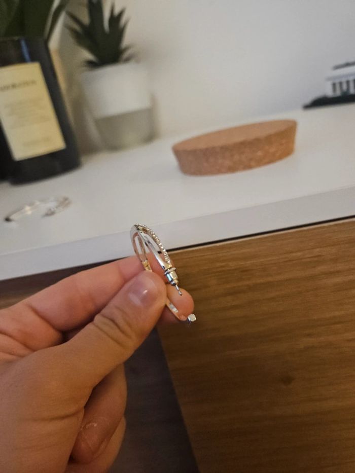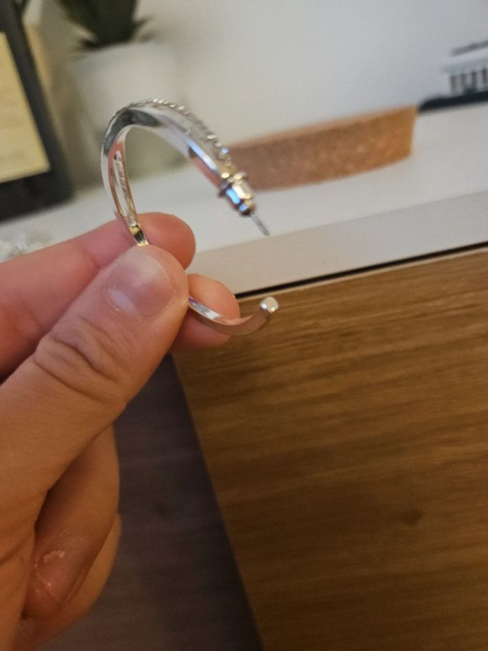 Boucles d'oreilles Type créoles Avec des faux strass Assez grosse Couleur argent ⚠️ Ce n'est ni de l'argent ni de l'acier inoxydable. Une des boucle est un peu abimé sur le côté (voir dernière photo) Les tiges sont noires mais je ne sais pas si c'est d'origine ou non comme on me les as offerte et je ne les ai jamais portée ce n'est pas mon style Il ne manque pas de strass