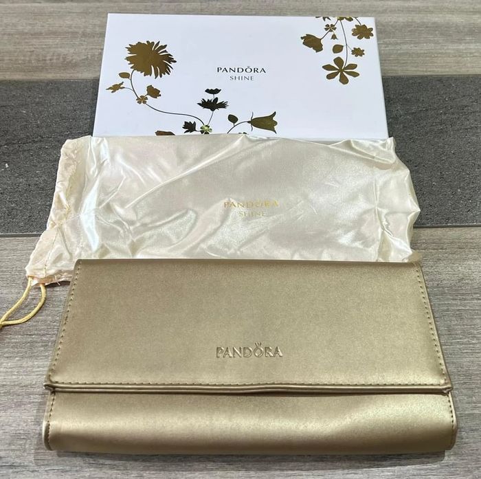 Pochette Pandora doré neuve jamais utilisé ! Mesure environ 20x15 cm Pochette pas très grande pas beaucoup de rangement à l’intérieur