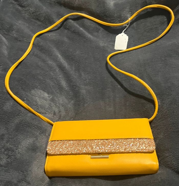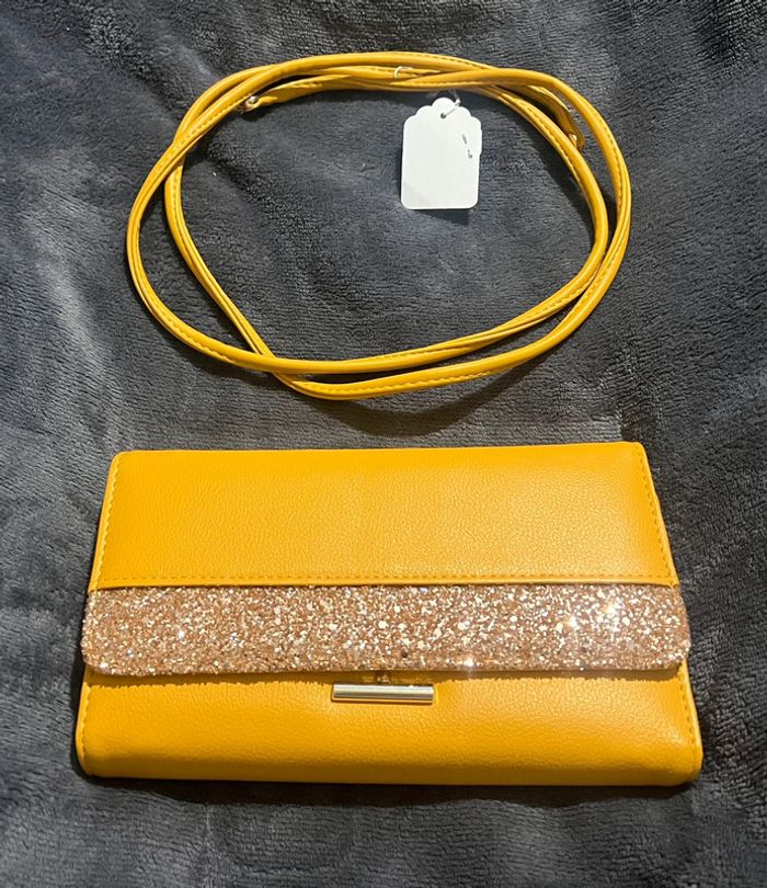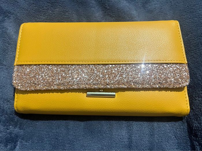 Grand porte feuille / monnaie moutarde et paillettes à bandoulière neuf - photo numéro 1