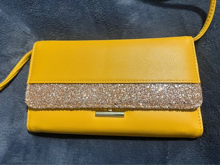 Grand porte feuille / monnaie moutarde et paillettes à bandoulière neuf Peut se porter comme un sac à bandoulière