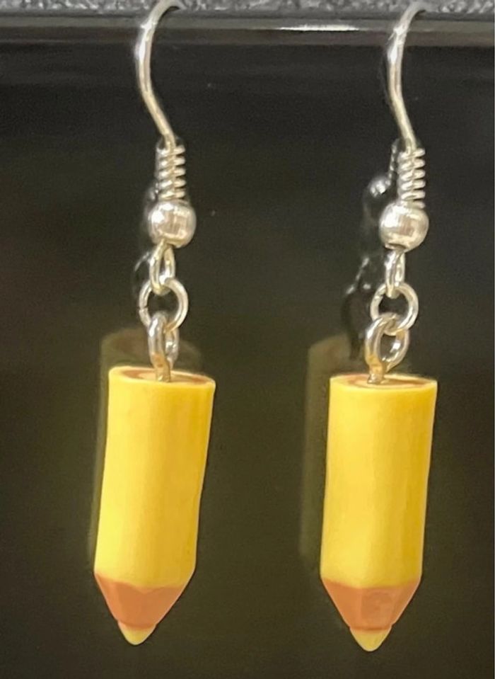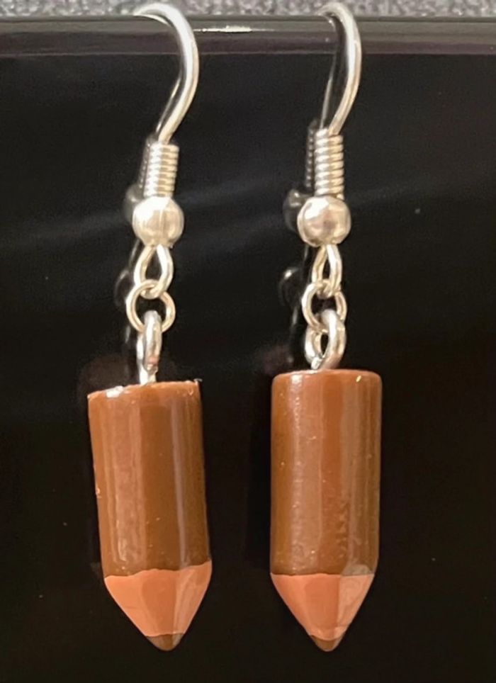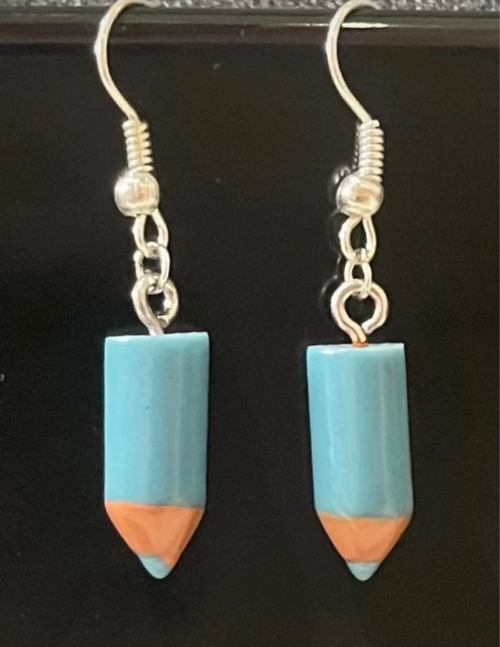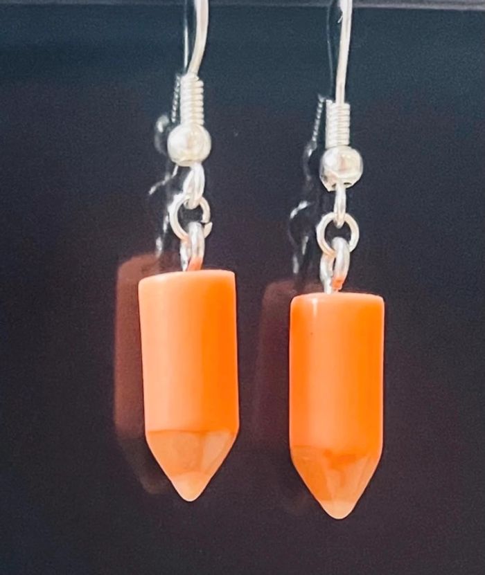Lot de 4 paires de boucles d’oreilles crayon neuf jamais porté ( une paire jaunes , une paire orange , une paire bleu et une paire marron ) . chaque paire sera dans une petite pochette cadeau organza