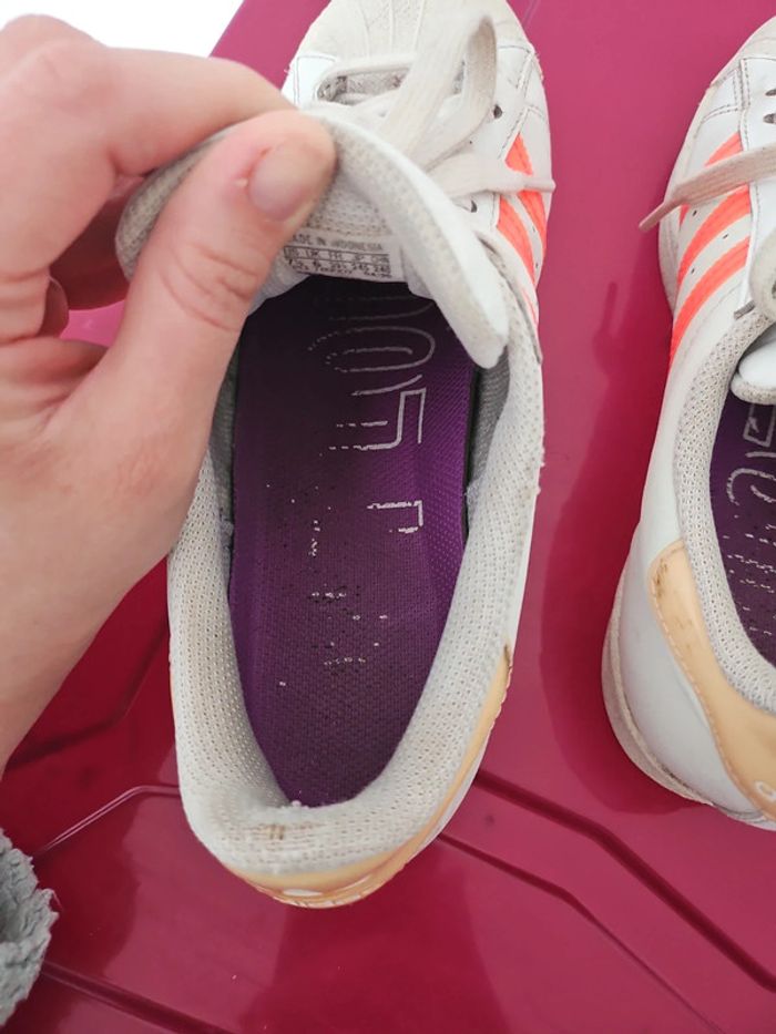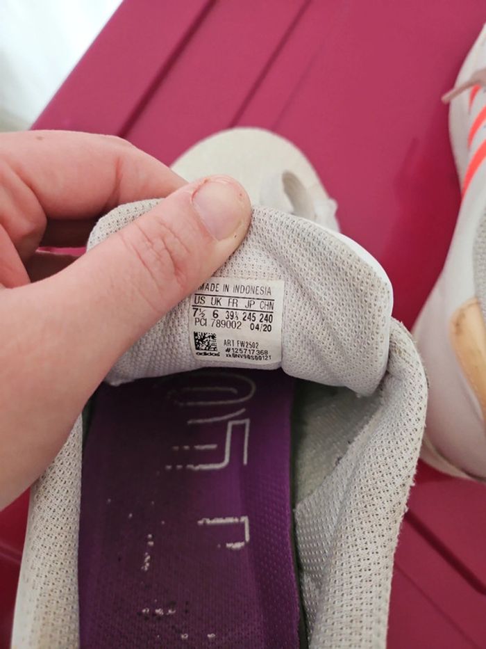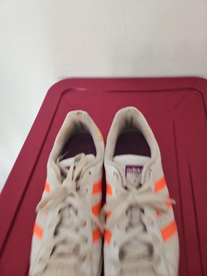 📏 Taille: 39 ⅓ ®️ Marque: Adidas 🌎 Pays de Fabrication: Indonésie 🎨 Colories: Blanc beige orange ✖️ Défauts: Un peu d'usure au tissus au niveau du talon 💐 Détails supplémentaires: Elles sont passées a la machine. Pas de photos portées.