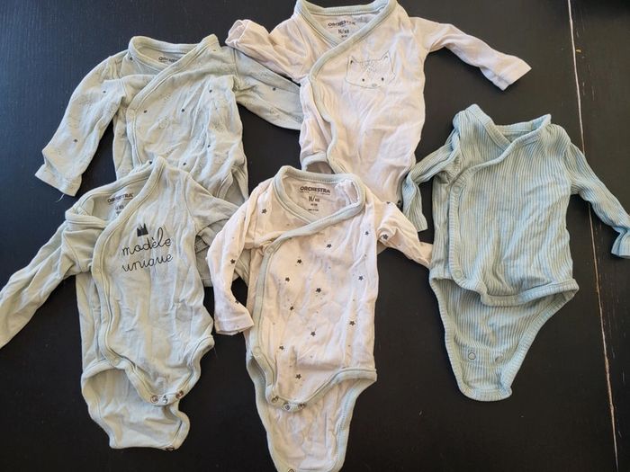 Lot de 5 bodies très bon état, marque orchestra (kiabi celui tout a gauche) taille naissance