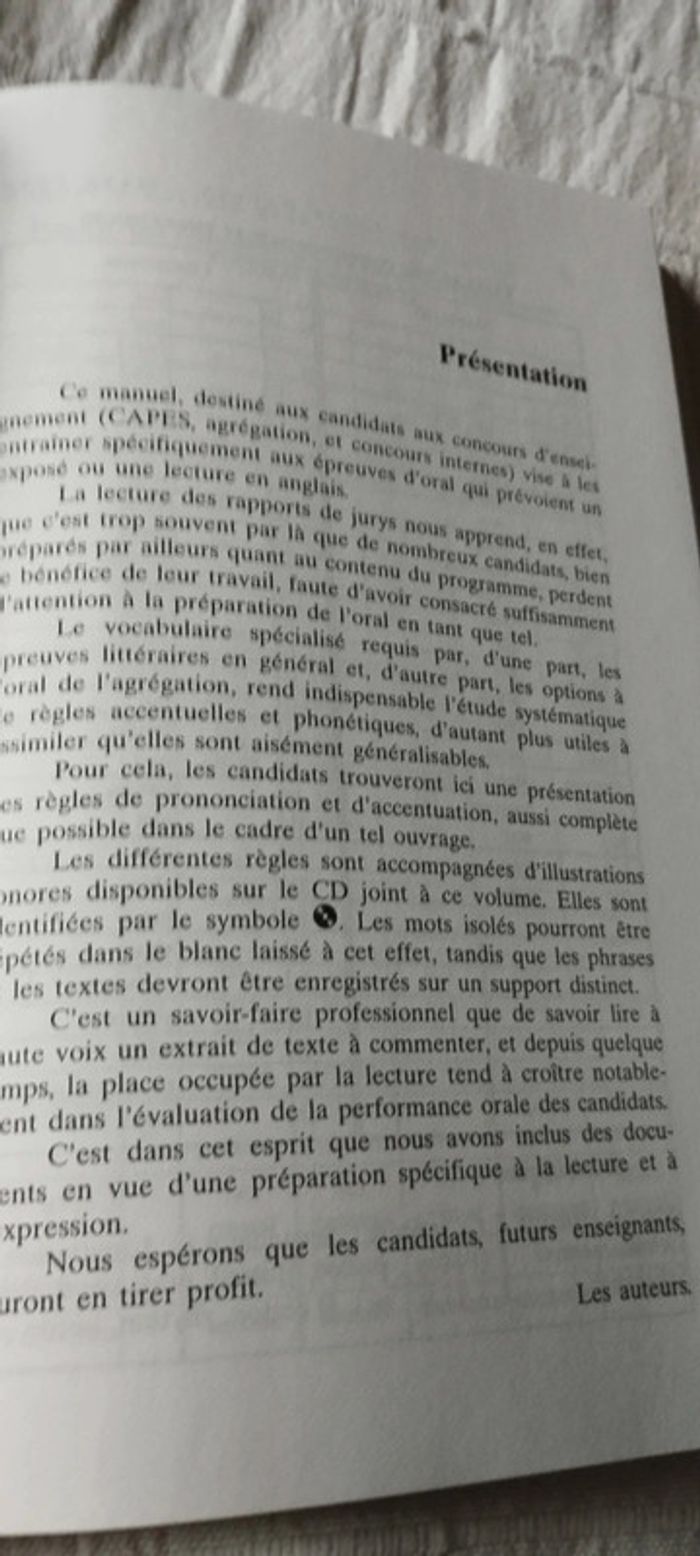 Livre avec CD Se préparer aux épreuves d'oral qui prévoient un exposé ou une lecture en anglais. Sur le CD audio qui accompagne l'ouvrage les candidats trouveront, d'une part, divers exercices d'entraînement, les différentes règles accentuelles de l'anglais, des textes pour l'entraînement à la lecture. Manuel d'anglais oral pour les concours. Très bon état. #linejacromans