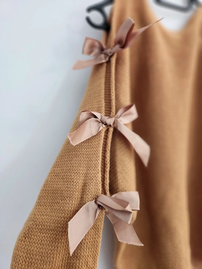 Pull noeud moutarde taille unique excellent état avec trou entre chaque noeud
