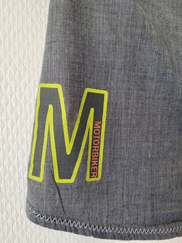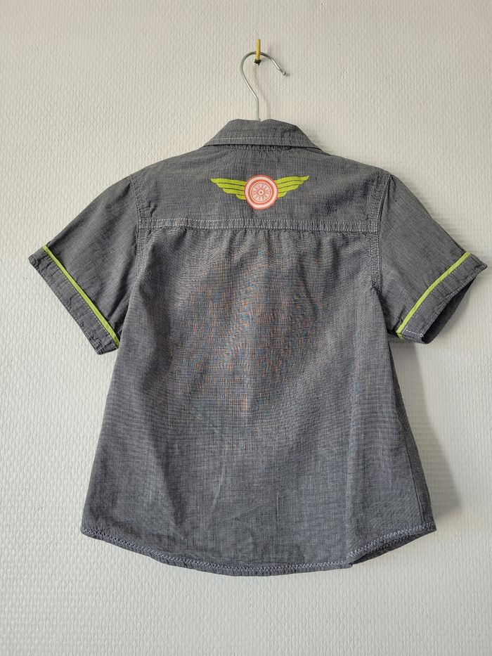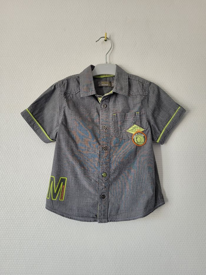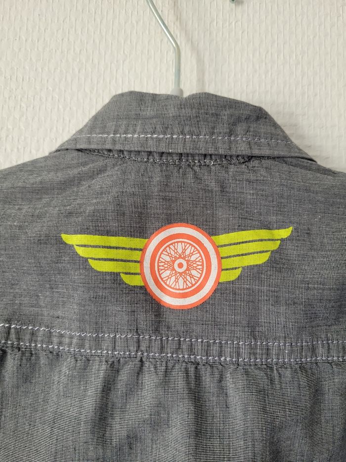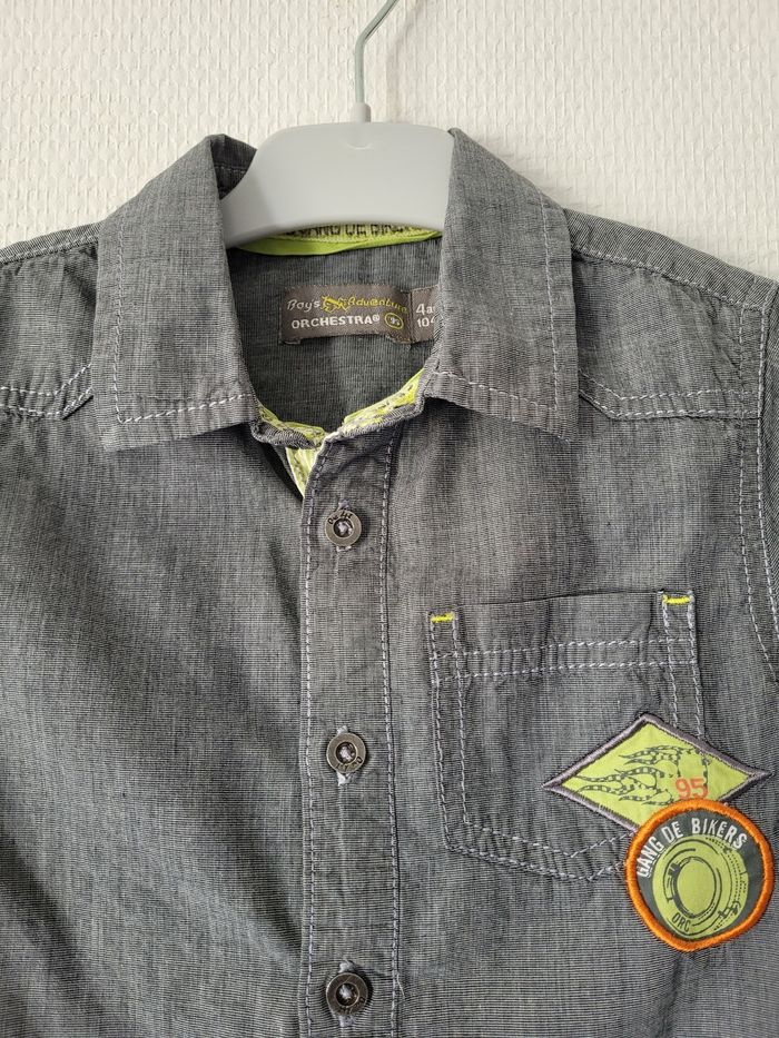 Chemise bleu/gris de marque Orchestra taille 4 ans Manches courtes Dessins biker vert anis 100% coton En très bon état