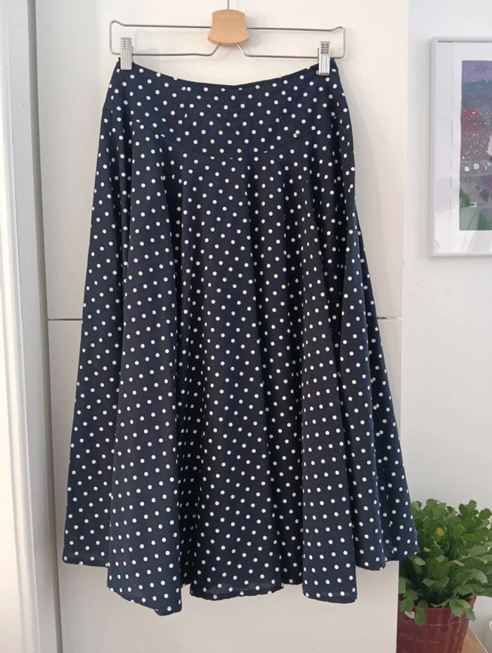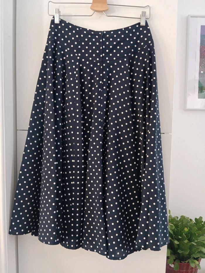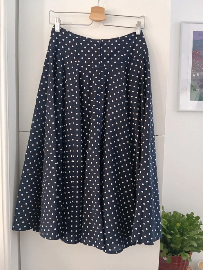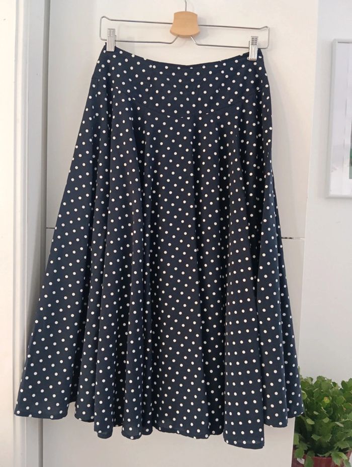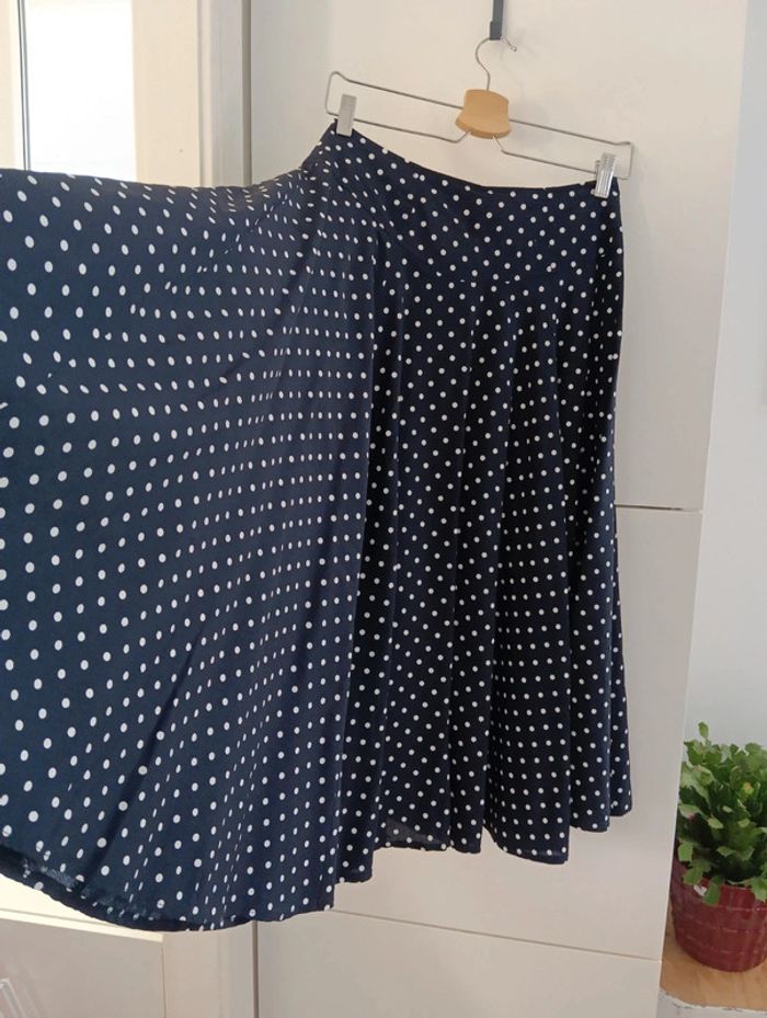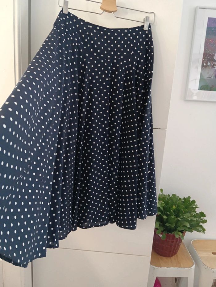 💙Jupe ample midi vintage . Jupe qui tourne, évasée. Marine à pois blanc. 100% viscose Fermeture éclair au dos Taille 36 estimée à confirmer avec les mesures Mesures Taille 34cm Longueur 80cm