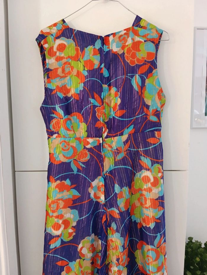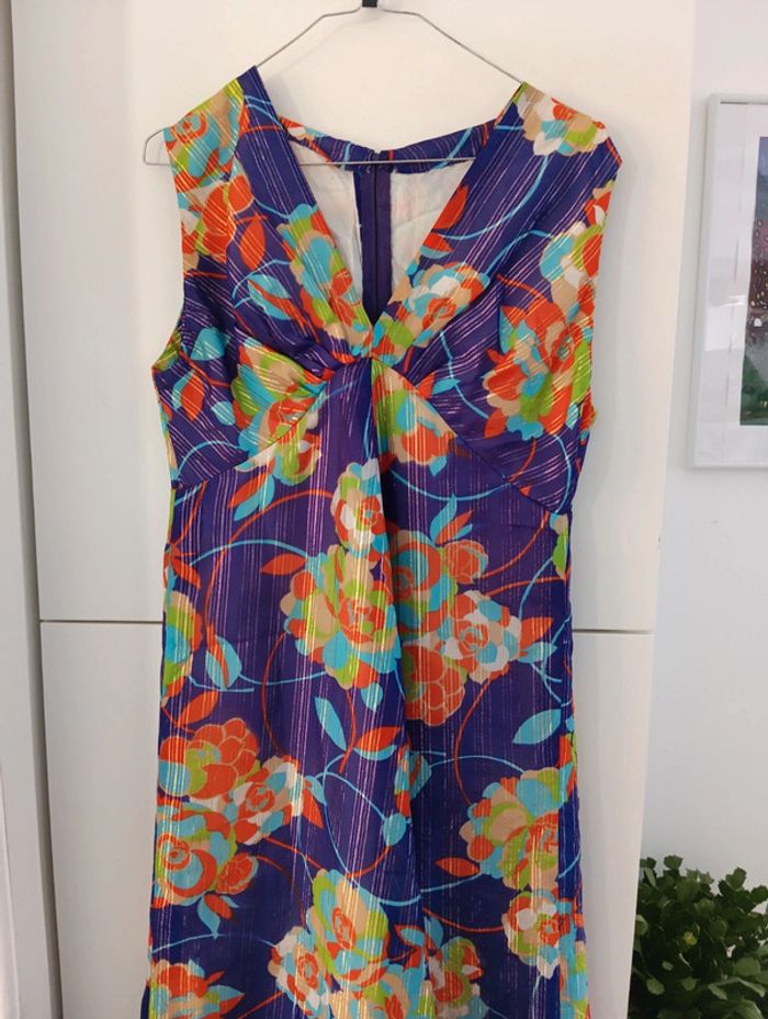 💐Magnifique robe vintage handmade 💐 💐 Jolie découpe au niveau de la poitrine 💐 taille M à confirmer avec les Mesures Coupe empire, évasée à partir de la poitrine Tissus voile violet à fleurs, rayures métallisée Fermeture au dos. Mesures Épaules 38cm Aisselles 47cm Longueur 147cm Légère Usure a