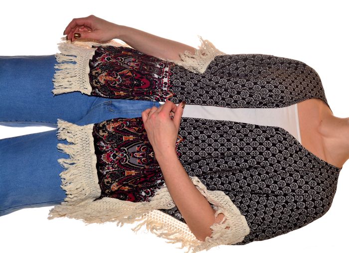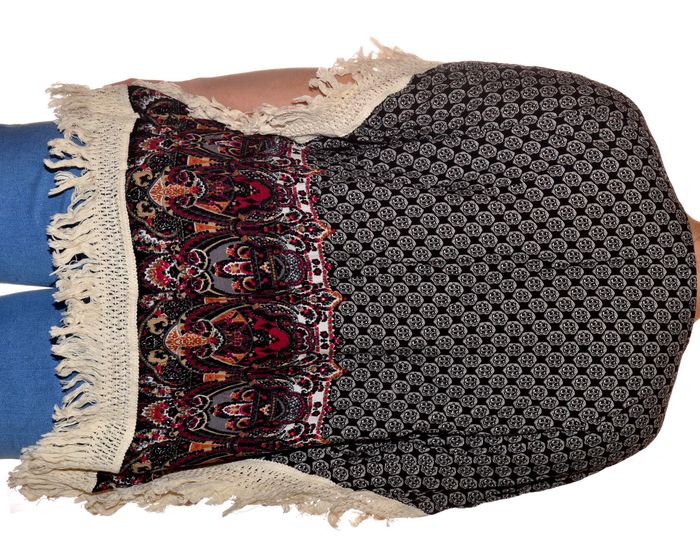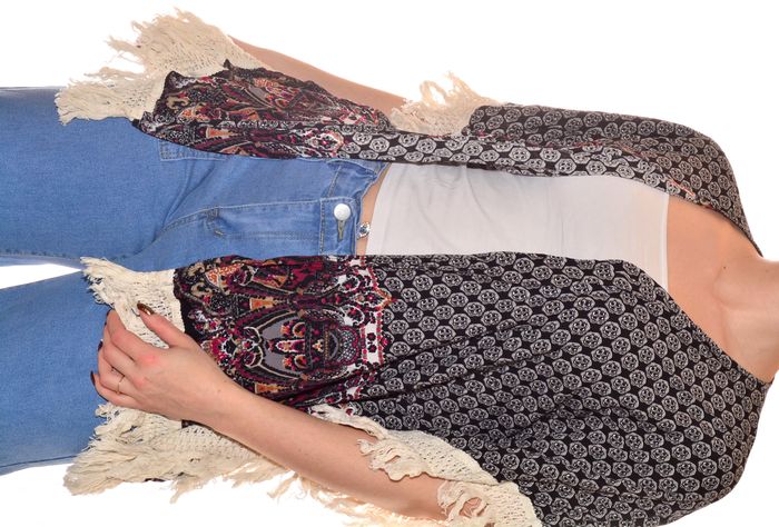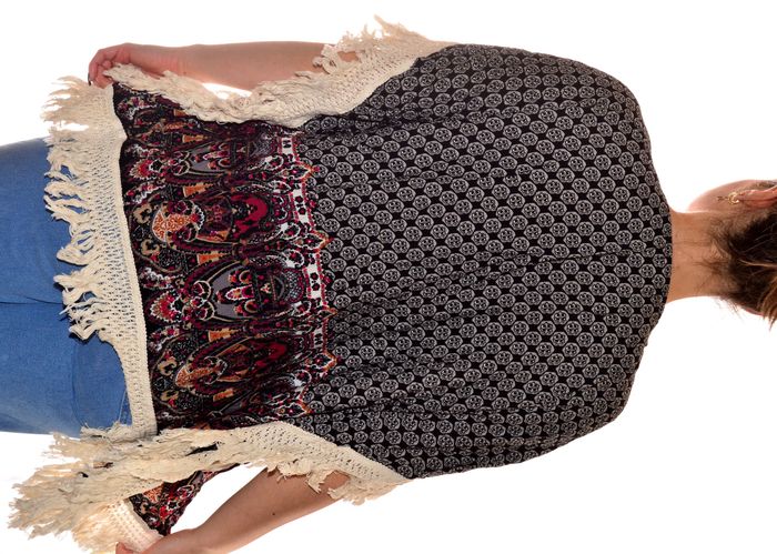 Cardigan/Boléro fin ouvert franges fluide taille M/L manches 3/4 noir à motifs colorés - photo numéro 1
