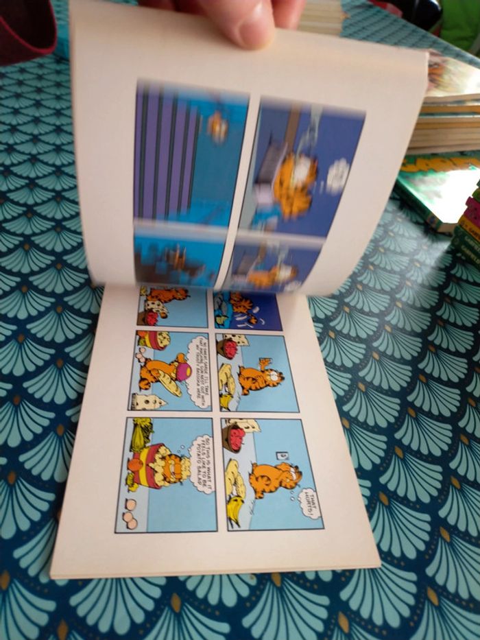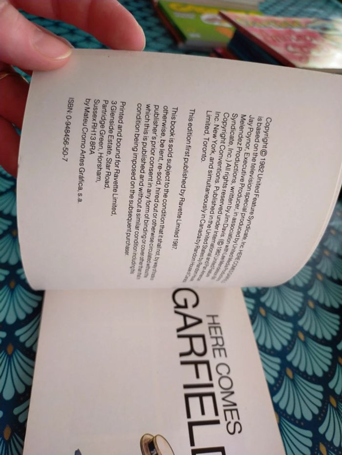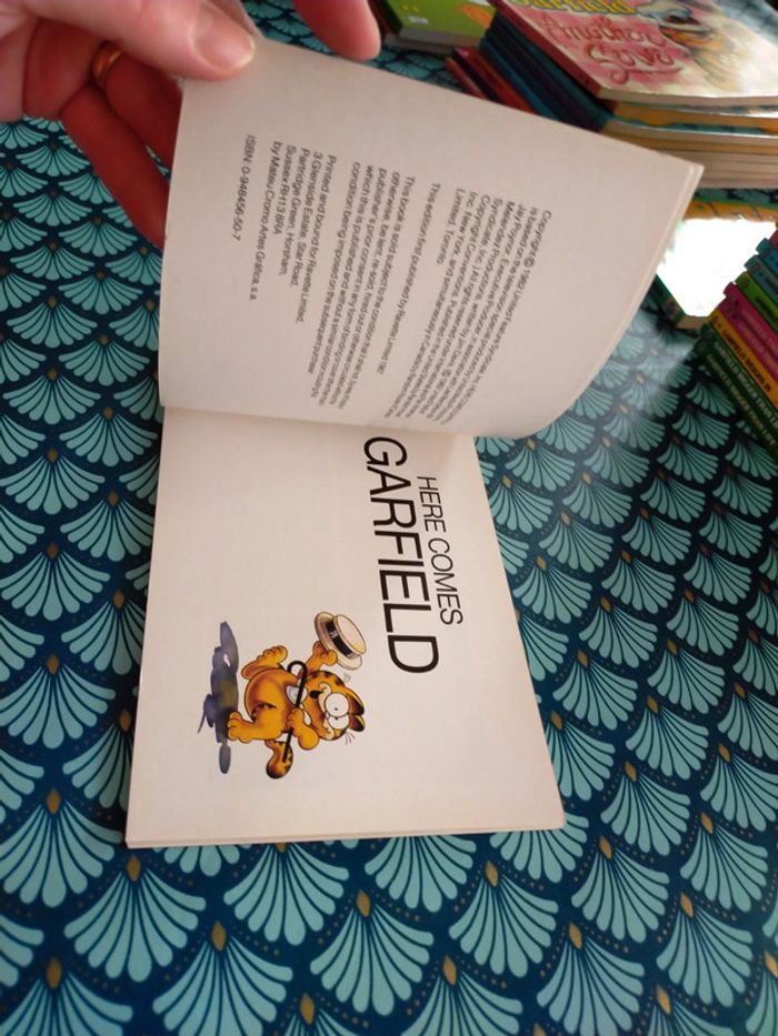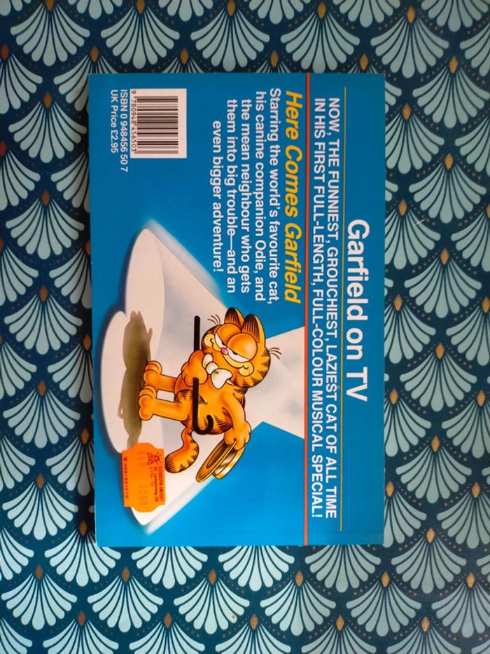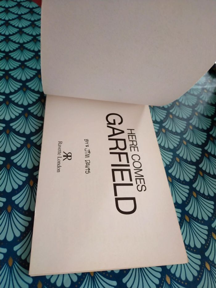 Here Comes Garfield Livre vintage format a l italienne Jim Davis Ravette London Très bon état avec petites traces d usure voir photo Jamais ouvert ni lu sauf pour les photos En anglais 1 ère édition juillet 1987