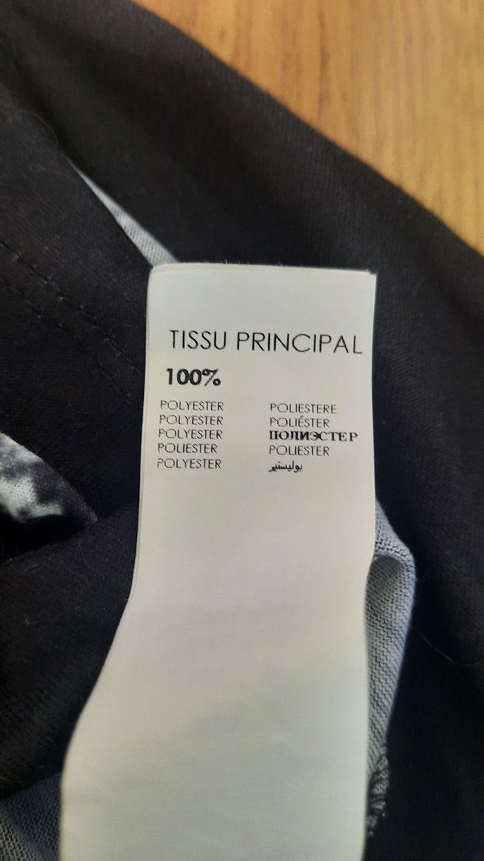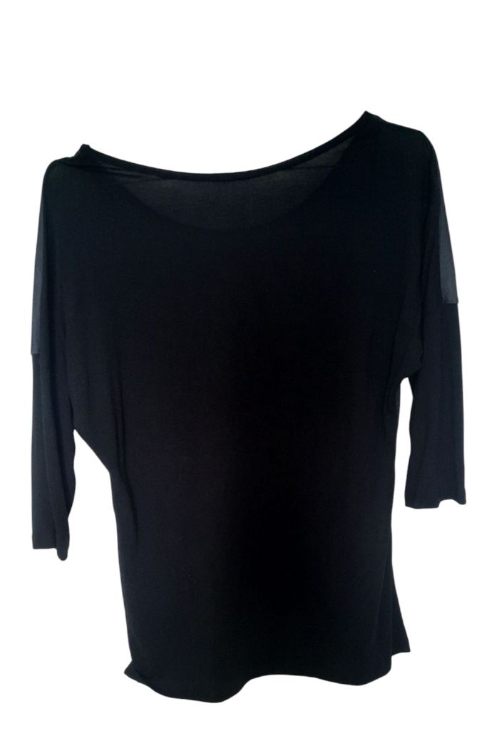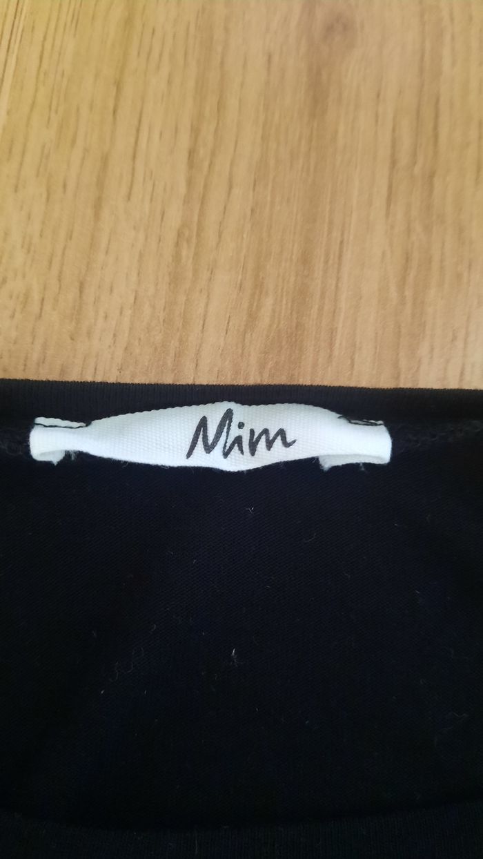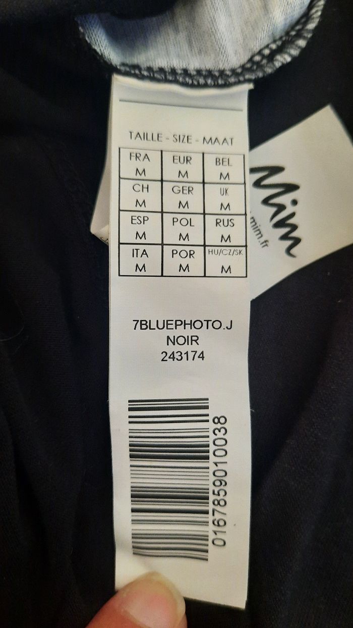 👚 T-shirt déjà porté encore en bon état 👭 T-shirt à manches 3/4 ( manches qui arrivent aux coude 📏 Taille : 38 ( M ) Dimensions : Largeur : 64 cm Longueur 65cm 🌈 couleur : noir, bleu, blanc 🏷 De la marque : Mim 🧾 matière : 100% polyester